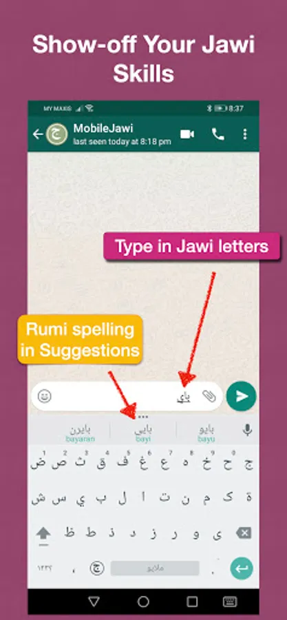 MobileJawi predicts the word you are trying to type and presents a list of suggested words. These words are shown in both Jawi and Rumi letters so you can cross check and be comfortable that you are indeed getting the word you want. It also auto-corrects the word before transliterating. Touching any of the suggested words will insert only the word spelt in Jawi into the text.