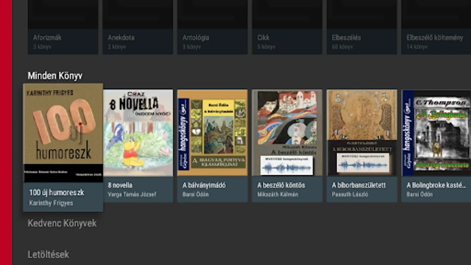 The catalog contains many classical novels, short stories, a classic or contemporary poem from authors like János Arany, Kálmán Mikszáth, Mór Jókai, Jenő Rejtő, Géza Gárdonyi, Elek Benedek, Frigyes Karinthy, The Grimm brothers and many others in Hungarian.