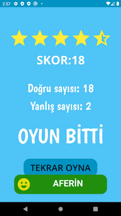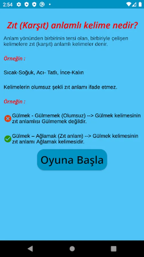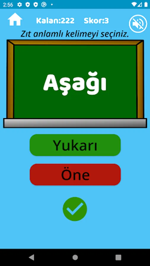 With the antonyms game, you can both learn the antonyms and have fun. The game consists of nine levels. Questions in each level are presented to you in a random order. You have to complete each level in a certain time. When the correct answer to the question is given, the correct option turns green and the other turns red. When you have a certain number of lines in each level, the next level is unlocked. After unlocking all the locks, you can close the locks again and start the game again. You can also turn the background music on or off during the game. People of all ages can play the game.
