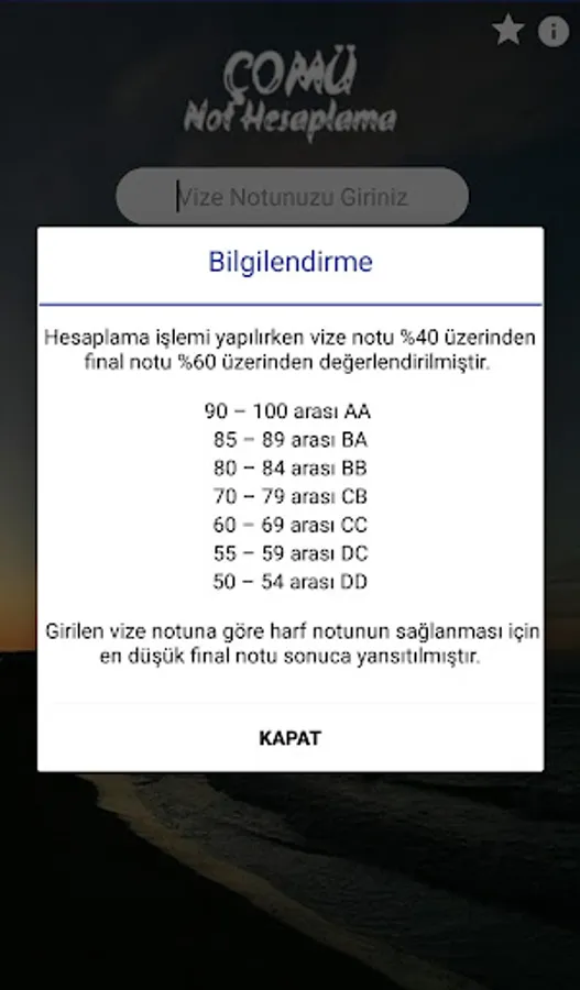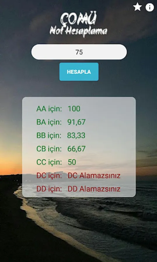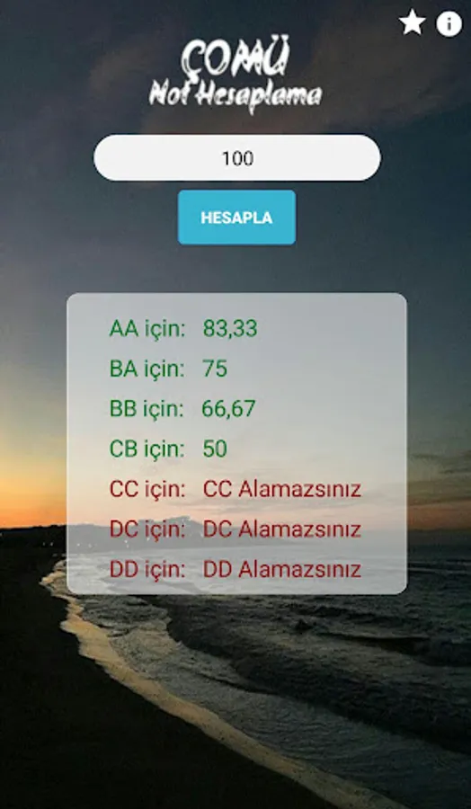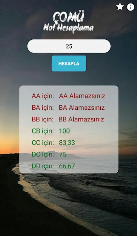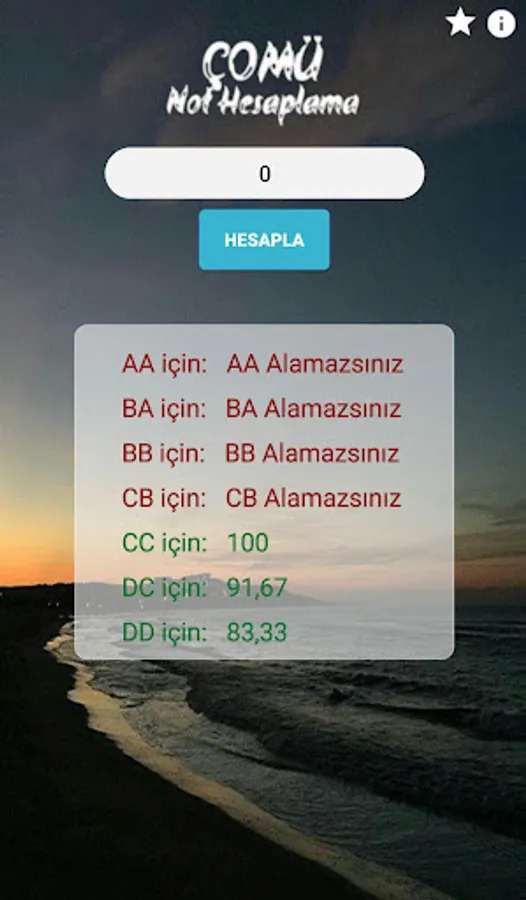 Eighteen Mart University of Çanakkale is an application for calculating the appropriate final grade students a letter grade they want to achieve by entering the visa notes.