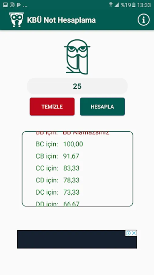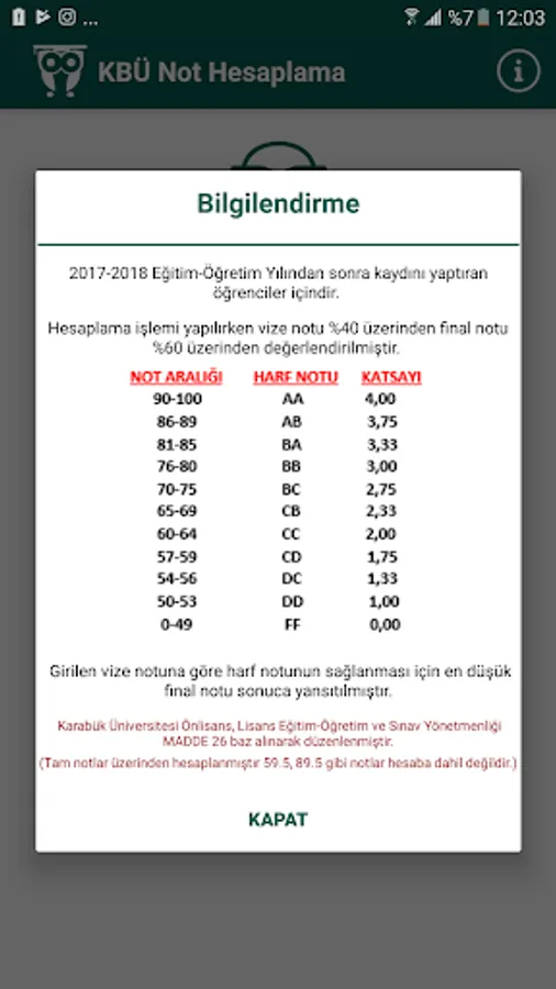 Karabük University students who enroll after the 2017-2018 Academic Year is an application for calculating the appropriate letter grade they want to reach the final grade by entering the midterm.