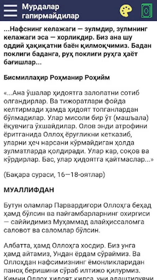 Butun olamlar Parvardigori Ollohga behad hamd bo‘lsin va payg‘ambarlarning oxirgisi — sayyidimiz Muhammad alayhissalomga salovot va salomlar bo‘lsin.