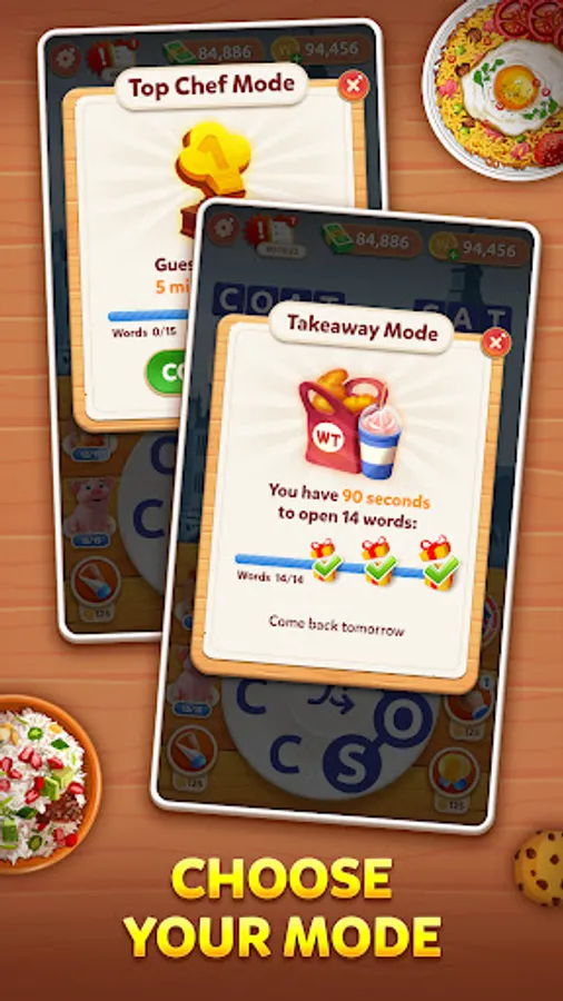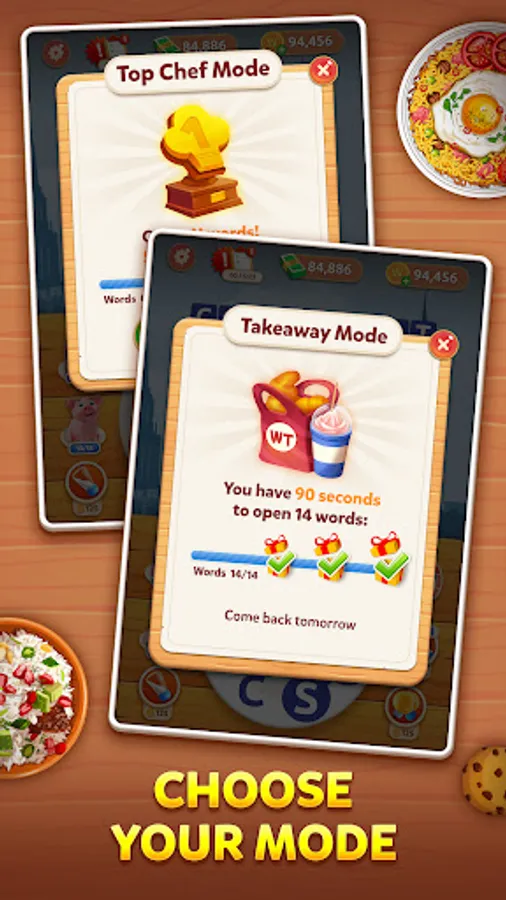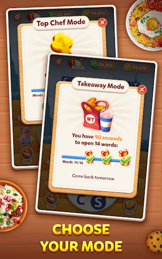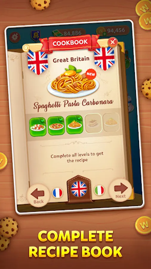Expand your food knowledge and recipe book. Unlock the dishes by solving word puzzles;