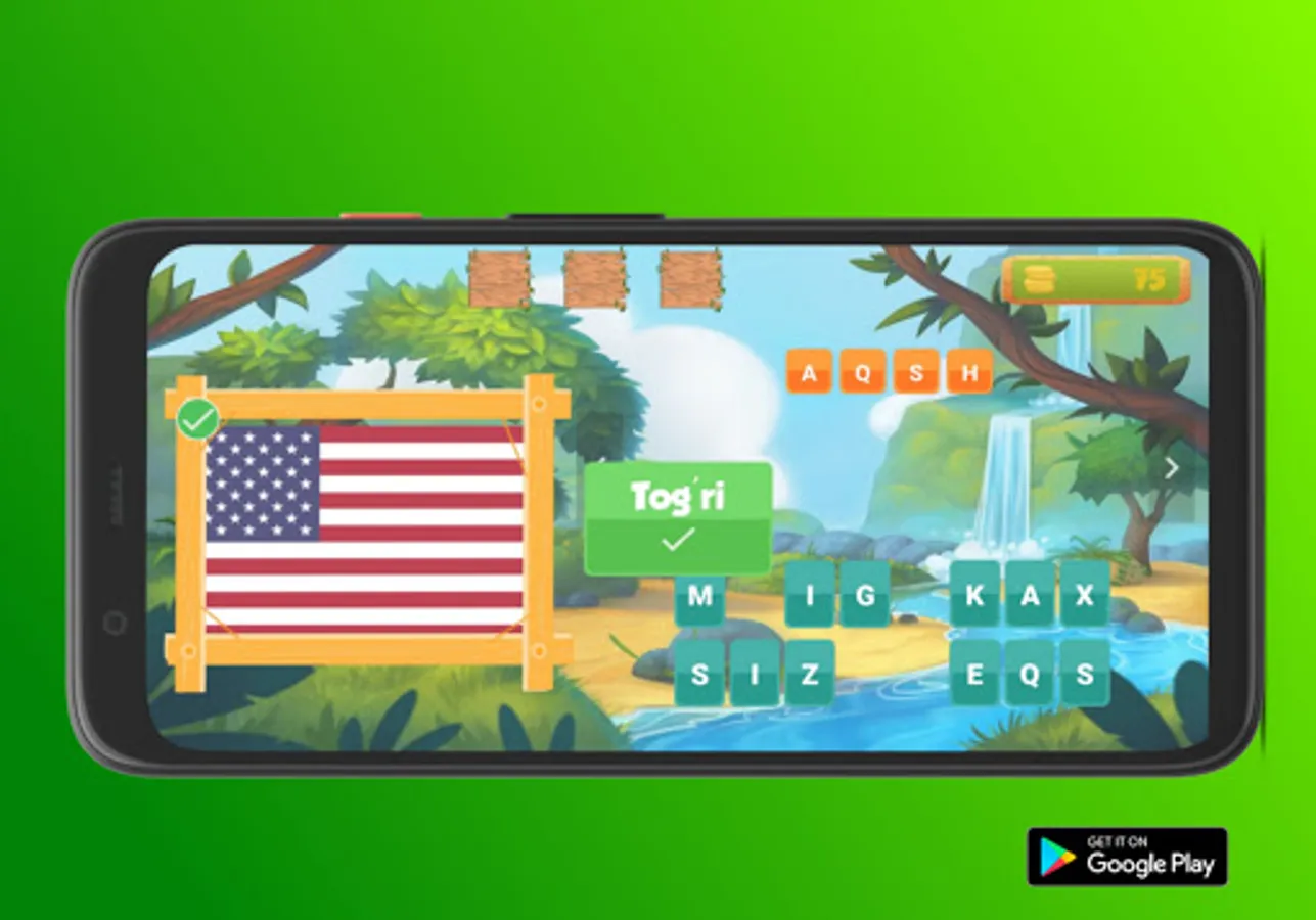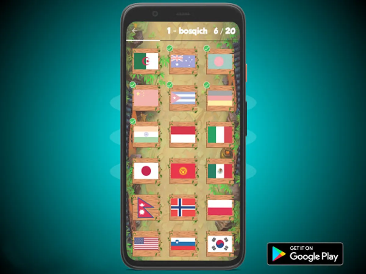 Ushbu o'yinda 9 xil bosqich mavjud bo'lib siz bu bosqichlarni birin ketin bayroqlar orqali davlatlar nomini topishib ochishingiz va biliminggizni yana ham mustaxkamlab olishinggiz mumkin