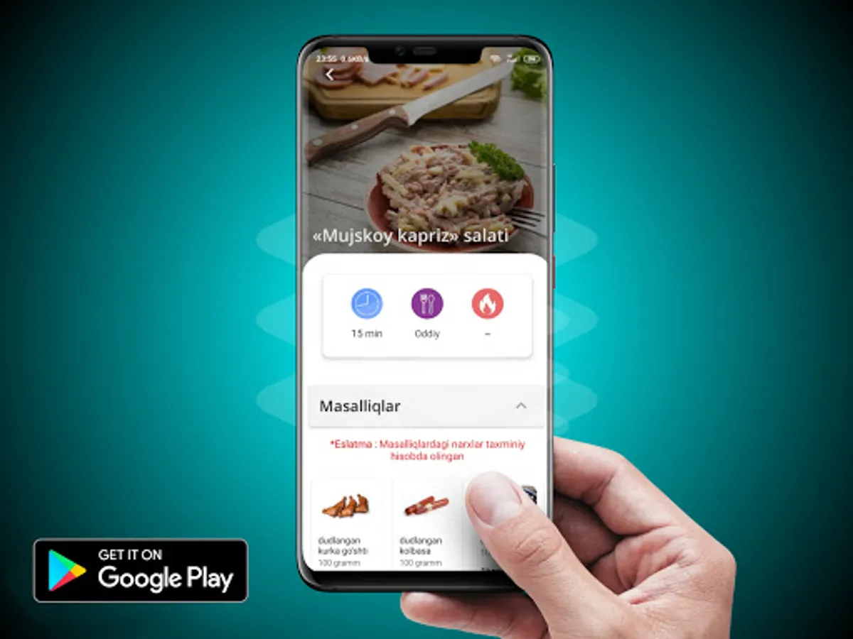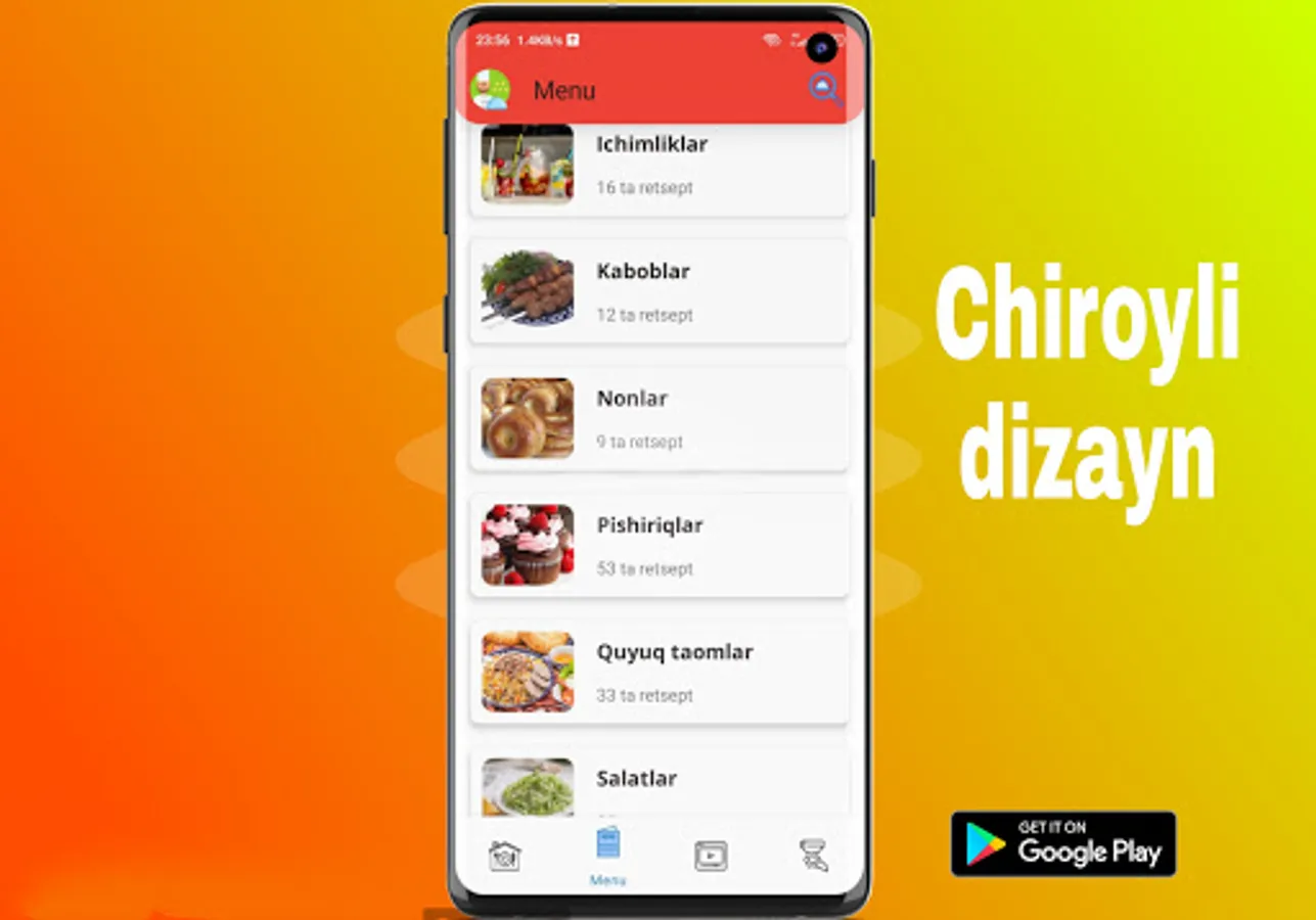 Bu dasturda 500 dan ortiq retseptlar va 200 dan ortiq video retseptlar keltirilgan. Bu dasturda o'zbek milliy taomlari va dunyo taomlari tayyorlanish jarayoni qadam va qadam ko'rsatilgan va yana juda ham chiroyli, tezkor foydalanuvchi interfacesiga ega. Bazi retseptlarda esa video retseptlar ham o'rin egallagan. Ushbu dasturimiz sizga albatta yoqib tushadi degan umitdamiz๐.