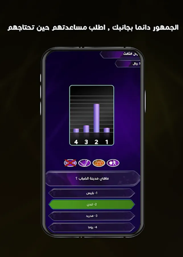 - تحتوي على جميع وسائل المساعدة وهي : الاتصال بصديق , الاستعانة بالجمهور , حذف اجابتين , وتغيير السؤال .