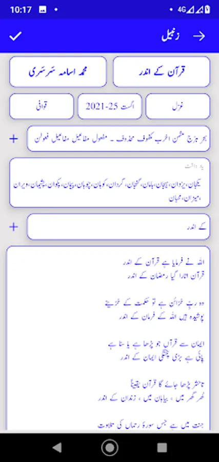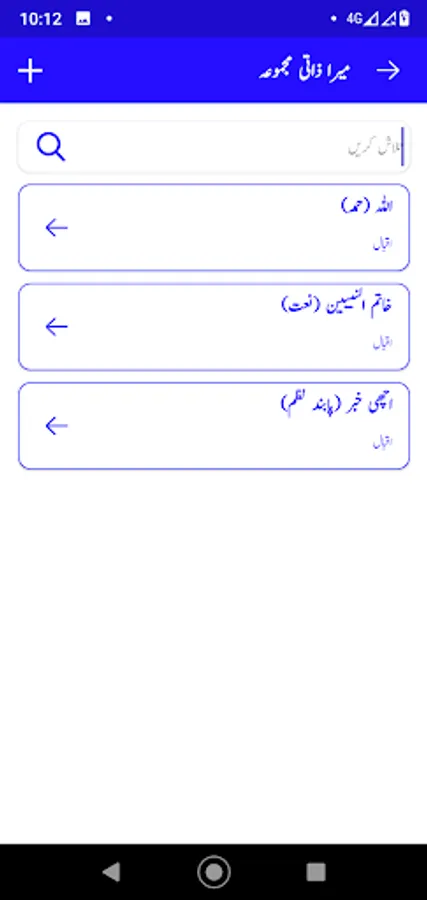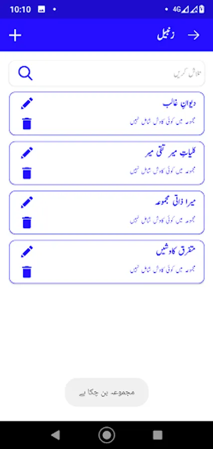 اس ایپ میں آپ بطور خاص اپنی شاعری یا کسی بھی شاعر کے متعدد مجموعے شامل کرسکتے ہیں، طریقہ یہ ہے کہ آپ "نیا مجموعہ بنائیں" پر کلک کریں، مجموعے کا نام درج کریں اور اوکے کردیں، مجموعہ تیار ہوگیا، اب اس میں آپ اوپر بائیں جانب بنے پلس کے بٹن پر کلک کرکے نئی کاوش شامل کرسکتے ہیں، جتنے چاہیں مجموعے بنائیں اور ایک مجموعے میں جتنی چاہیں کاوشیں شامل کریں۔