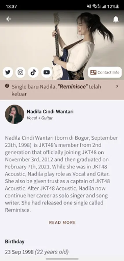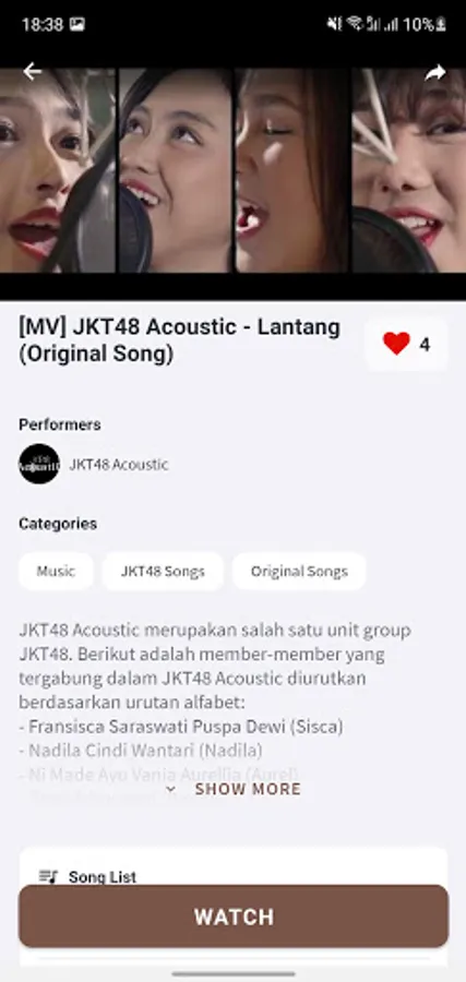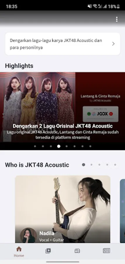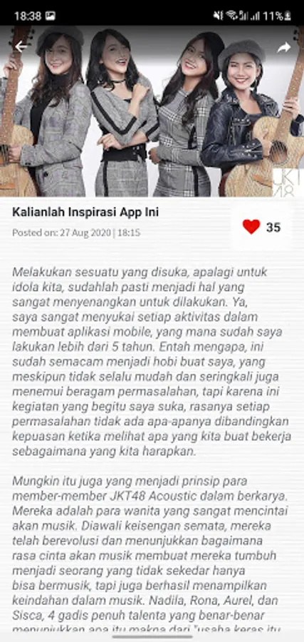 This app is made as a place for gathering various content about JKT48 Acoustic, each of their personnel works, so that their fans can easily search and enjoy their works and performances. Also to give an update of activities and works from Nadila, Rona, Sisca, and Aurel to their fans. App developer hopes for support from the users to use this positively and participate in contribute posting all content related to JKT48 Acoustic or each of their personnel whether it's a video or fan letters.