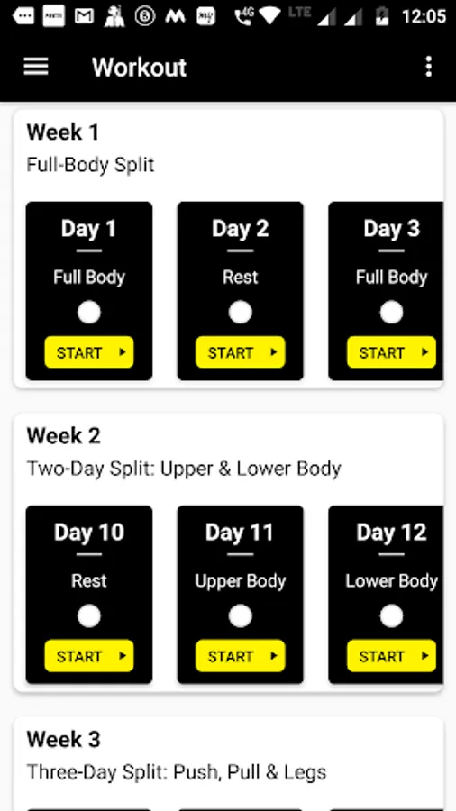 You’re only a week into the program, yet you’ll begin to train different bodyparts on different days with a two-day training split Opens a New Window. (meaning the entire body is trained over the course of two days, rather than one as in the first week). You’ll train a total of four days this week; the split includes two upper-body days (Monday and Thursday) and two lower-body days (Tuesday and Friday), and each bodypart is trained twice. Wednesday, Saturday and Sunday will be your recovery days.