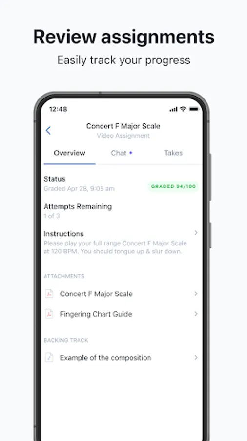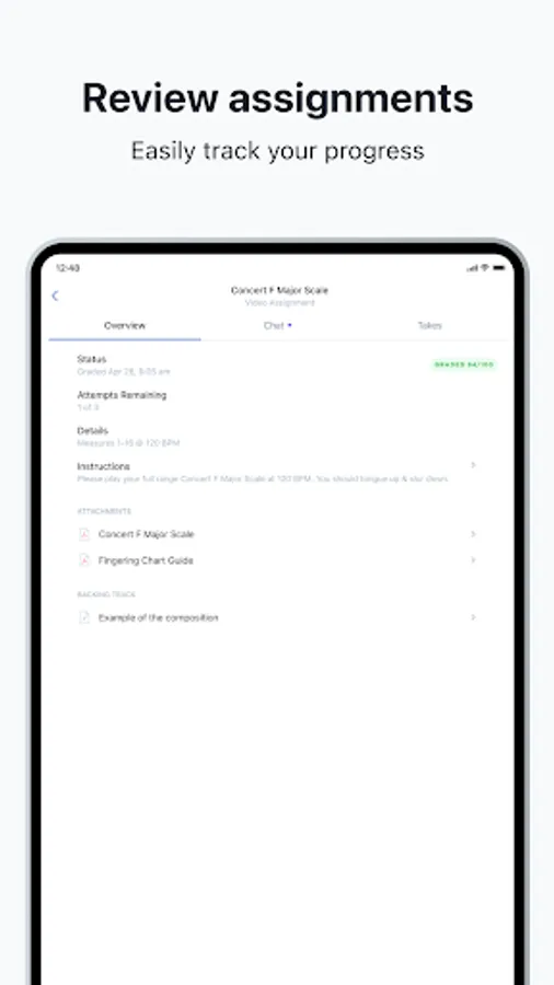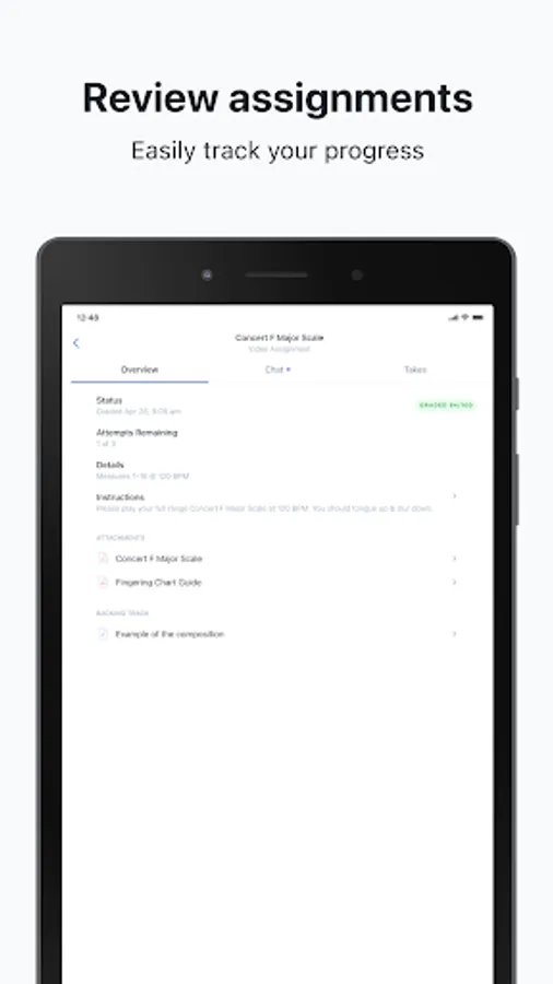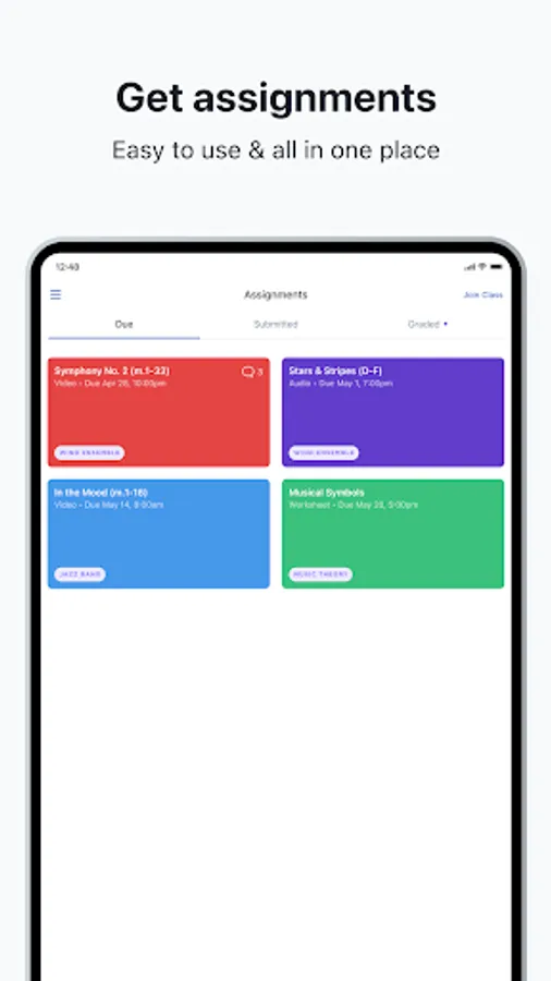 MuseClass includes a built-in tuner and metronome, which helps students tune their instruments and play in time. When learning a new piece of music and recording their assignment, students can record as many attempts as they like and choose the version they like the most, and can submit it safely and securely to their teacher directly from their mobile device.