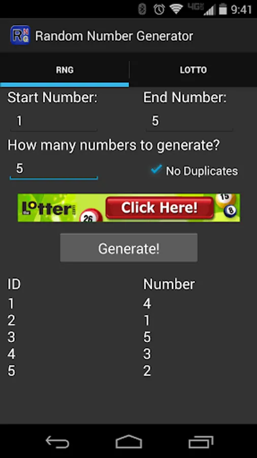 Random Number Generator is a simple and easy to use Android application that let's you generate nearly endless random numbers as well as those winning lottery numbers!
