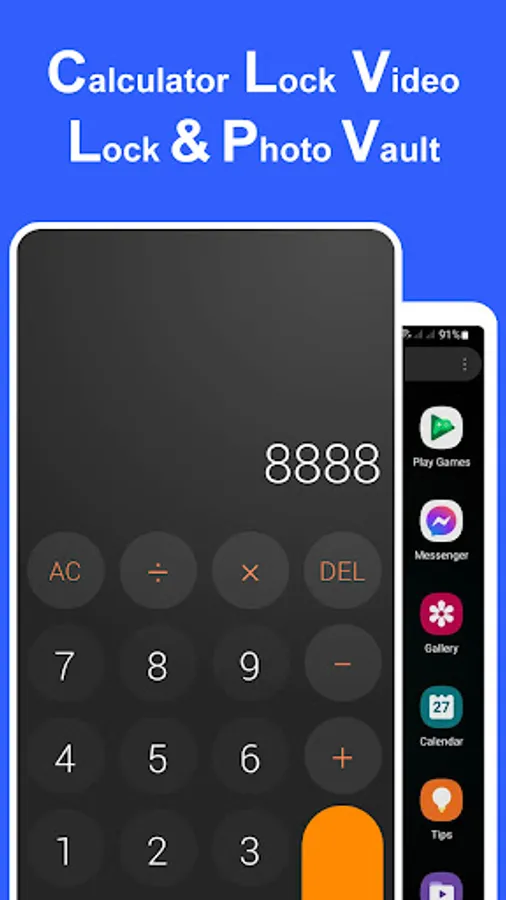 Calculator lock is a vault app that can quietly cover up photos and videos while making your phone's gallery lock appear to be a standard calculator. Your files will be kept in a vault where they can only be accessed after entering a numeric PIN on the calculator.