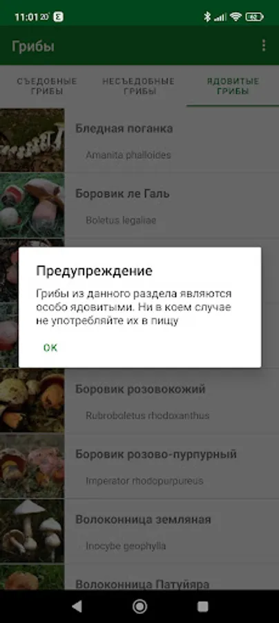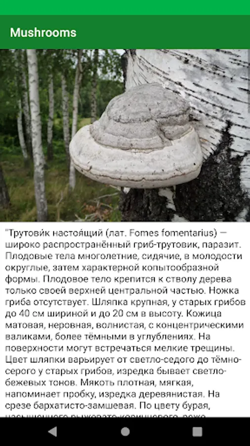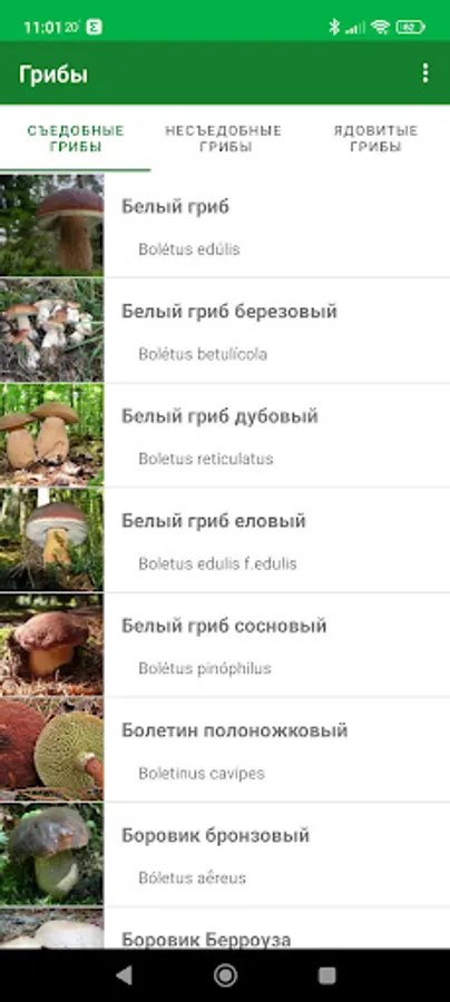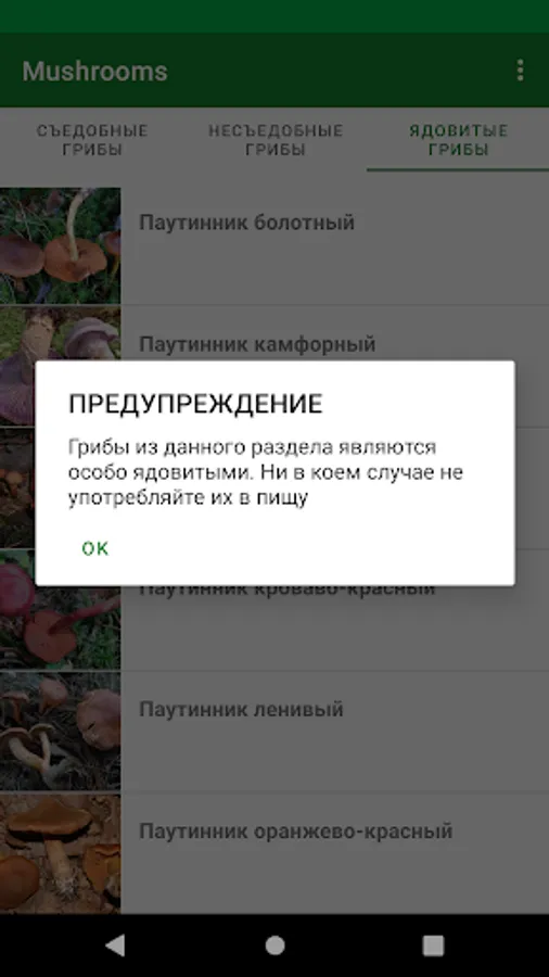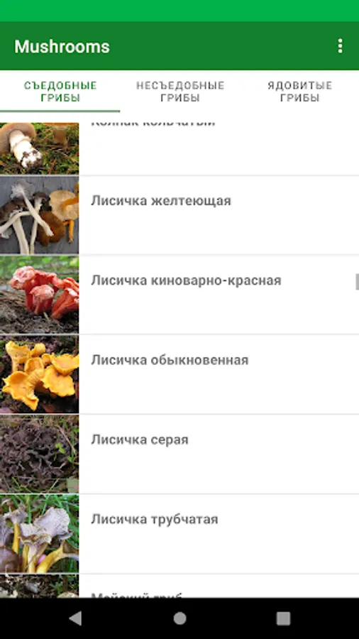 Mushrooms are divided into 3 categories: the lists contain mini-illustrations for visual identification of the type of mushroom, as well as detailed information on each mushroom, with a large picture inside.