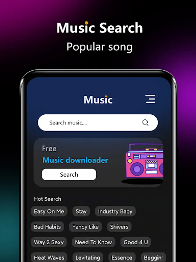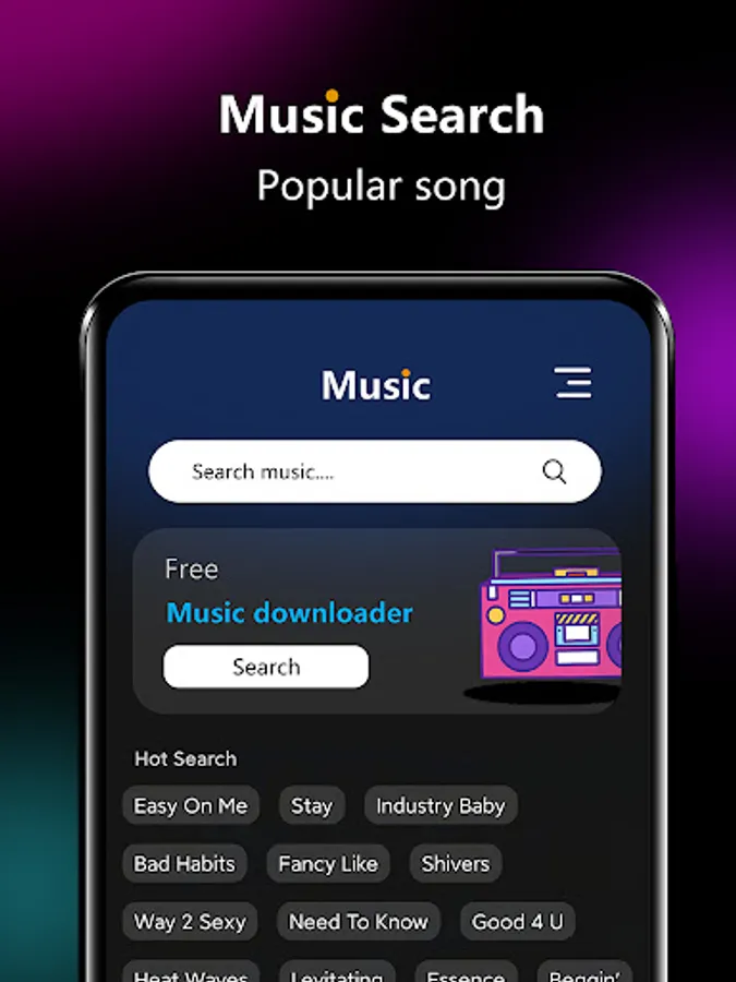 "Music Downloader - Mp3 music download" is a free music player and mp3 download application that gives you a chance to download or play most popular free music songs.