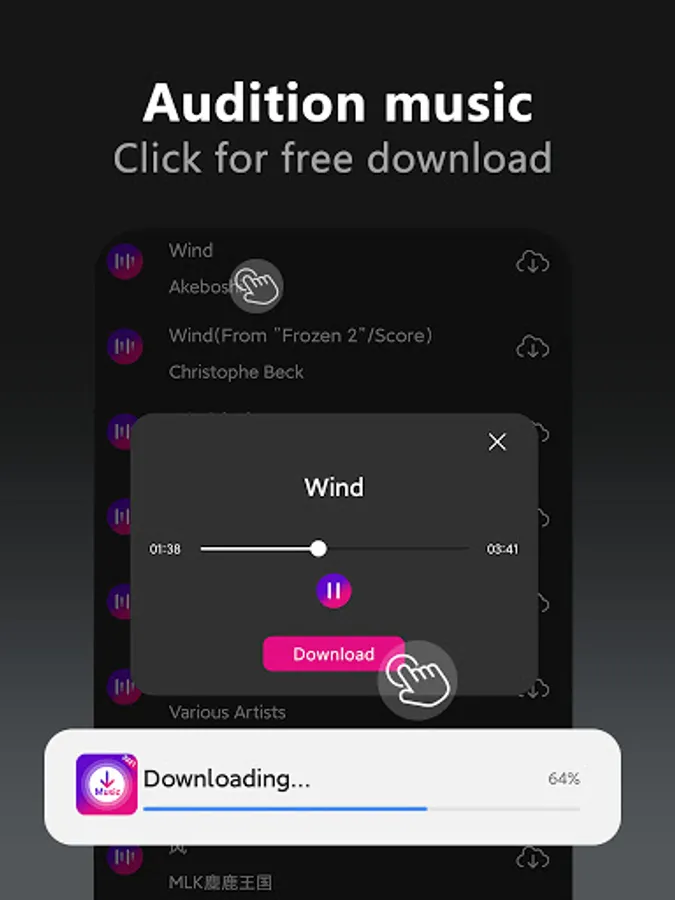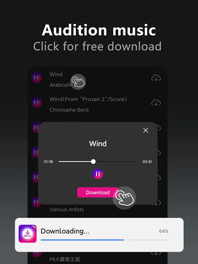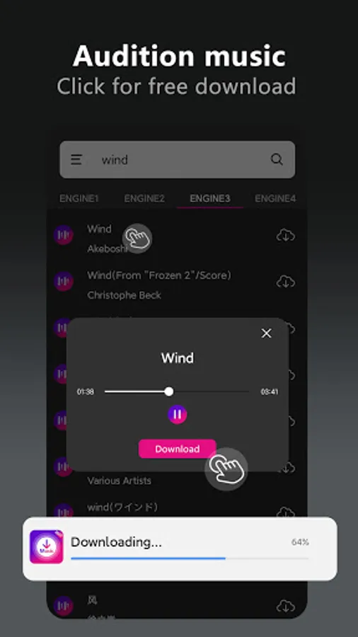 Music Downloader is the powerful and simple app to search, listen and download music! Feel free to download free mp3 music and audio files.