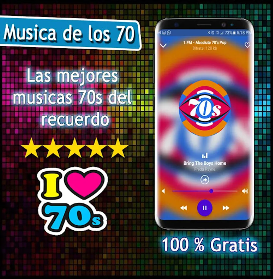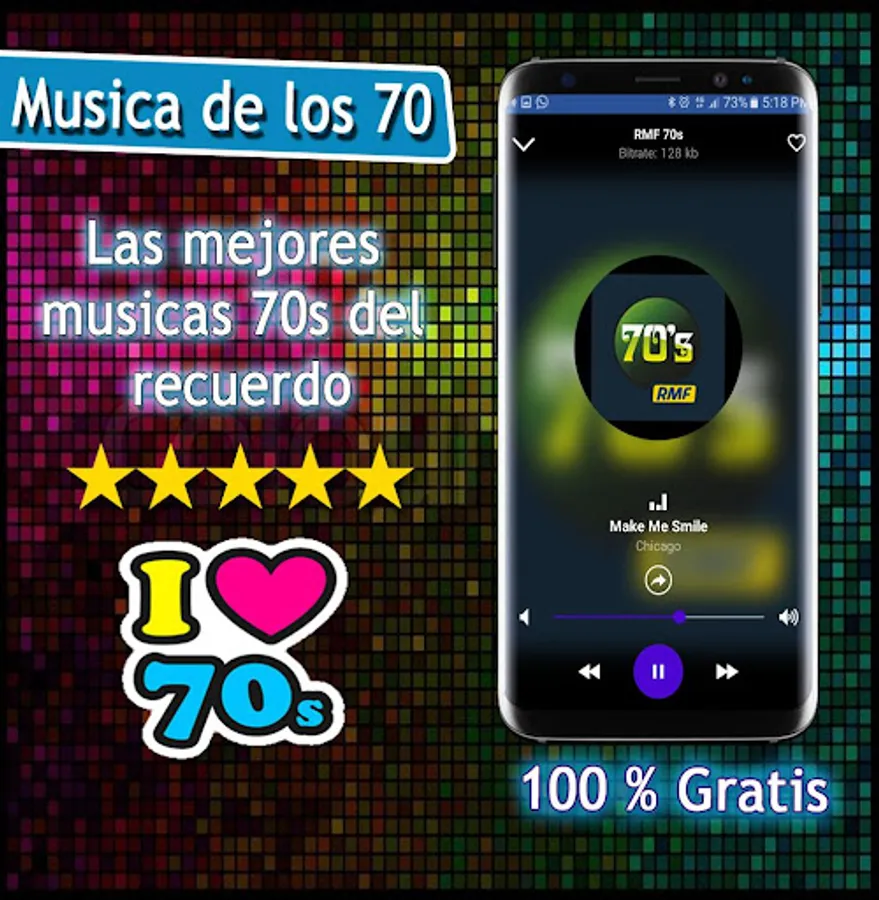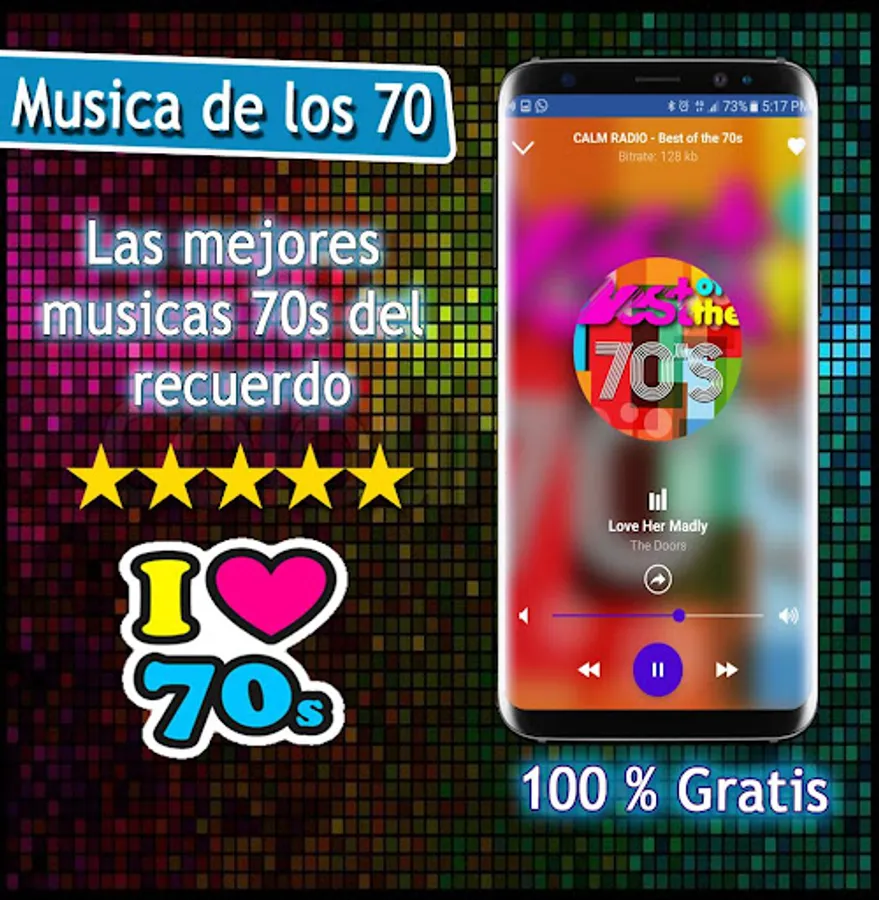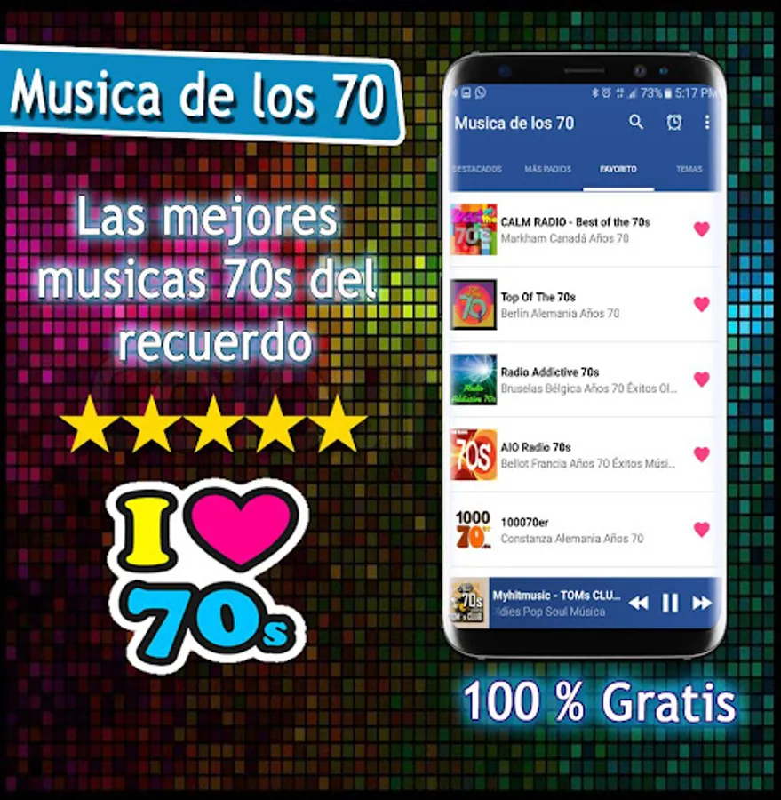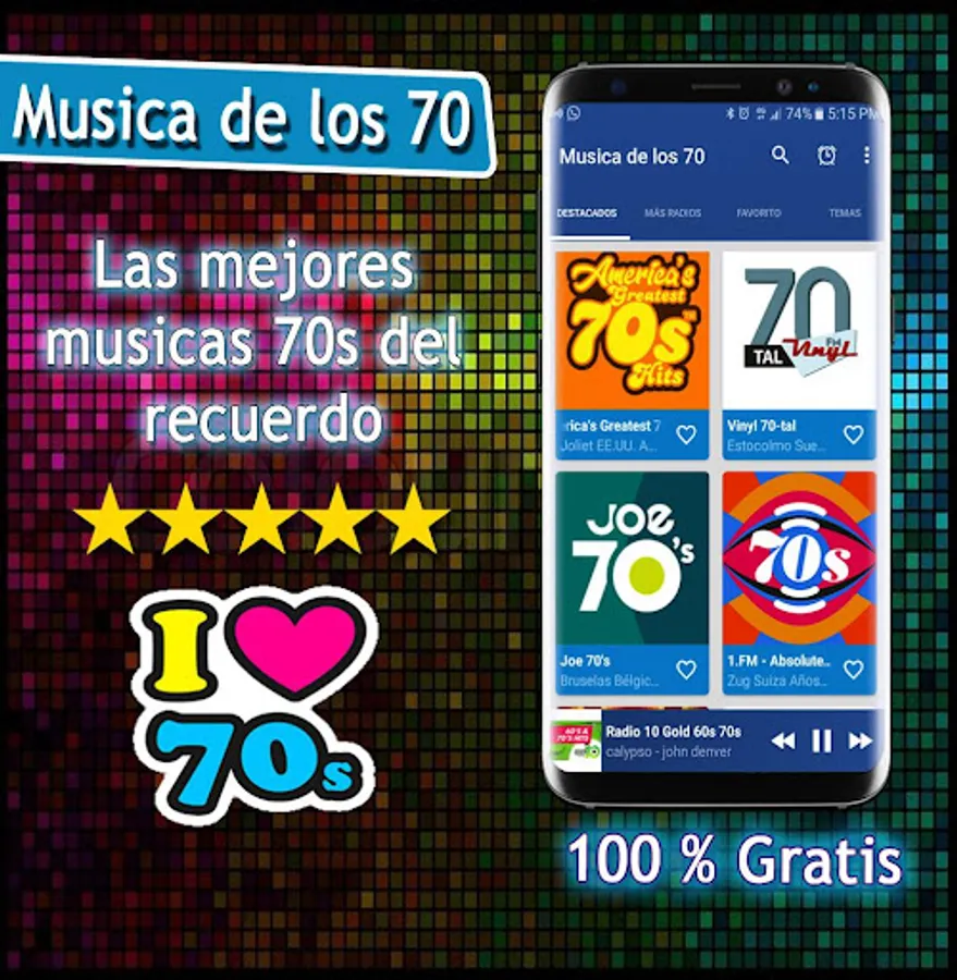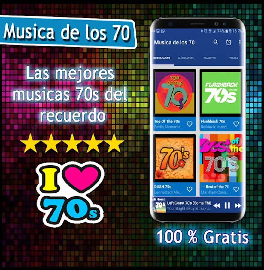 Musica de los 70 is a free application of the main music radios of the 60 70 80 and 90 in Spanish, music of the 80s, 70 Music Radio, music of the 60s and 70s, disco music delos 80 and 90, among other genres musical of the moment. The list of radios included is varied.