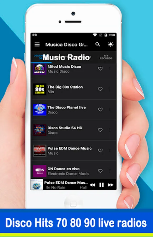 If you are a lover of Disco Music 70 80 90 Radio live this application is perfect for you. It is made so you can enjoy where you can choose only hits Disco, Techno.Dance, electro disco music from the 90s from different radio performers that broadcast live.