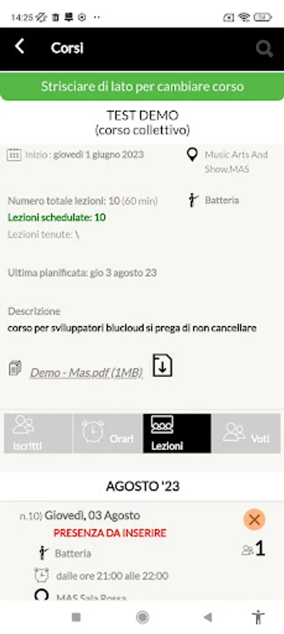 The system allows users to manage the various aspects of the center in a simple and advanced way, from courses to the lesson calendar, from attendance to recovery, payments from members and towards teachers.