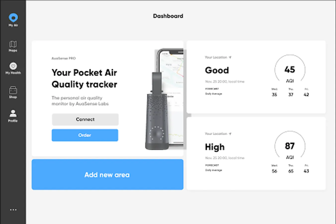With AuaSense, users can monitor various pollutants, including PM2.5, PM10, NO2, and SO2, and access comprehensive analytics and charts that show historical trends, daily and monthly averages, and air quality forecasts. Users can also track their exposure to air pollution over time and receive personalized health recommendations based on their risk levels