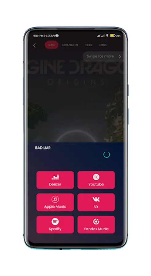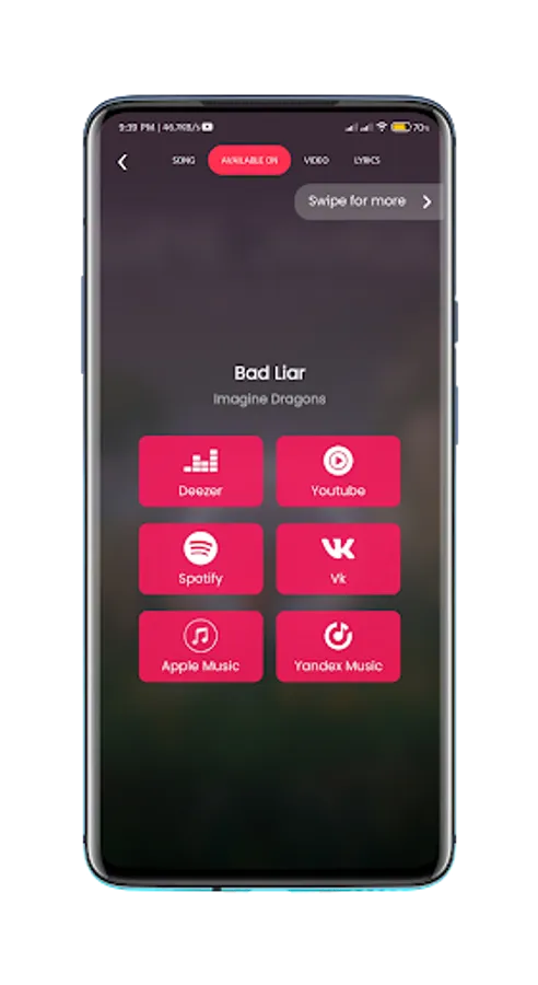 Music Finder lets you play a music preview of the identified track and give you the option to listen to the full song on Deezer, Spotify, Apple Music, Youtube, VK, and Yandex Music streaming services.