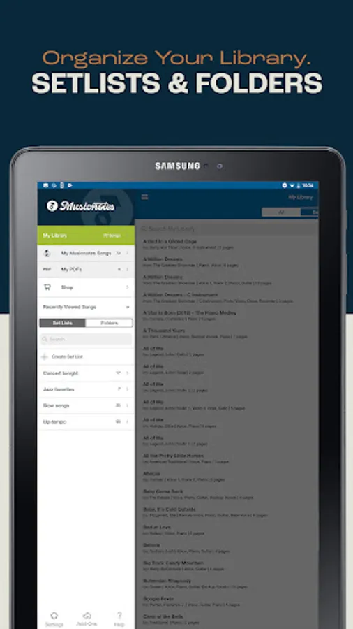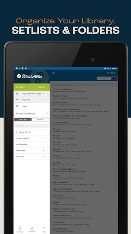 The Musicnotes App lets you play music, create set lists, and take your sheet music anywhere. Whether music is your hobby, your profession, or your passion, Musicnotes has you covered with instant access to the largest high-quality collection of sheet music arrangements. It’s the app you can trust for ultimate portability without sacrificing reliability.