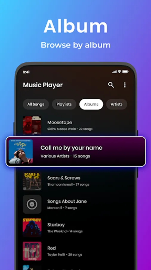 • Browse by albums, artists, music playlists, genres, folders etc