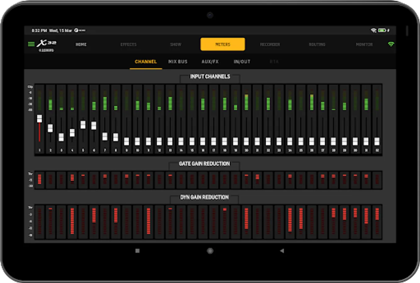 • Meters - Input channel, Mix Bus, Aux/FX, IN/OUT, Gate Gain, Dyn Gain