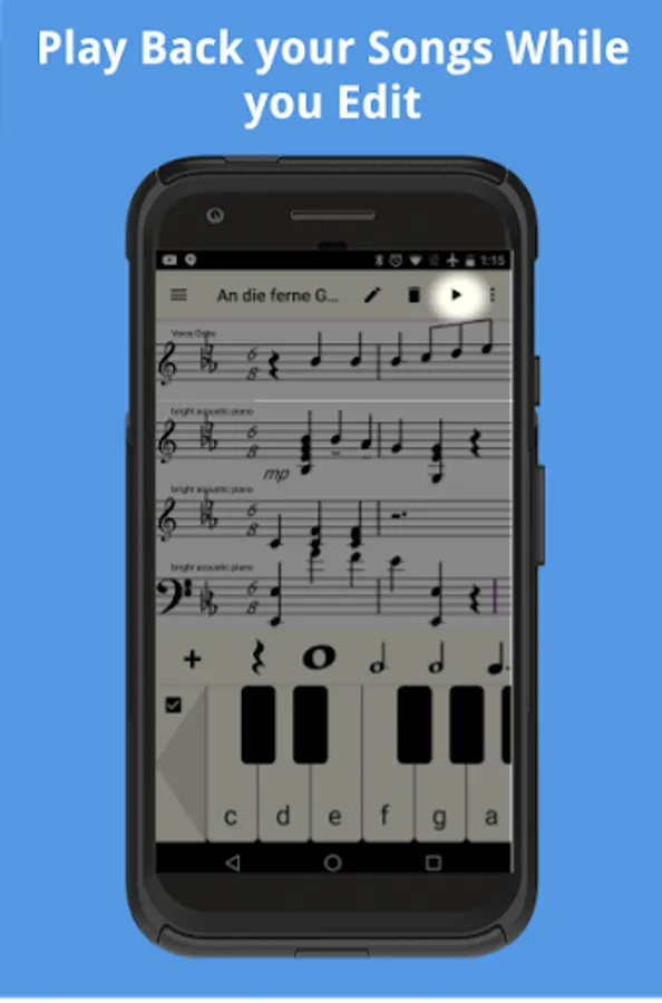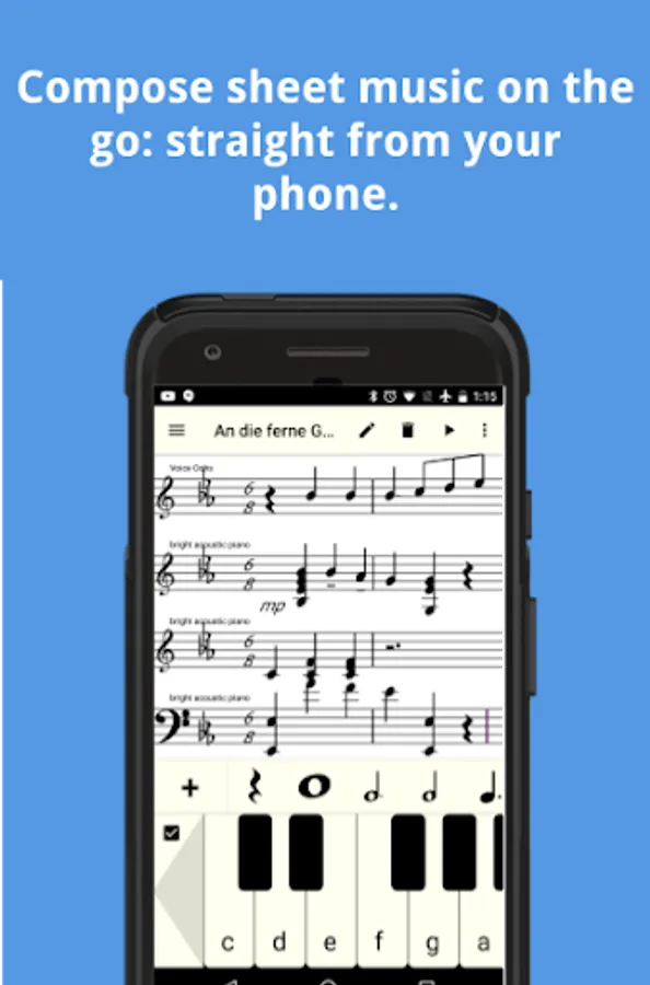 Compose music simply using a piano keyboard to enter the notes. Use this app to compose and edit sheet music. Open music XML files from popular sites like musescore and edit them.