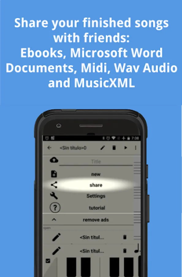 Export your songs to midi, wave audio files, docx(Microsoft word), epub(ebook), and musicxml files to share with fellow composers.