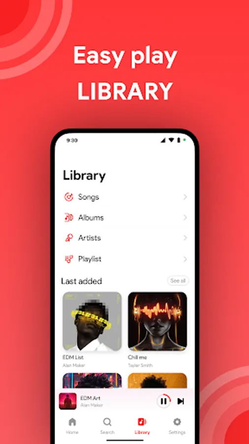 For fast and easy navigation we placed all important components of the app (like Main player, Queues, Folders, Albums, Artists, Playlists) in just one row. So you can access them with just 1-Tap!