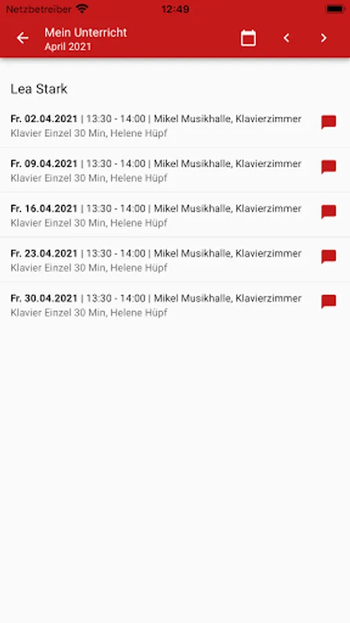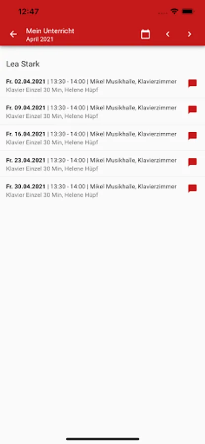 All functions for the exchange of messages between teachers, parents, students and the music school do not require any contact information. Messages are transmitted via an ID that is internal to the app. No email addresses or cell phone numbers are required to chat and exchange messages!