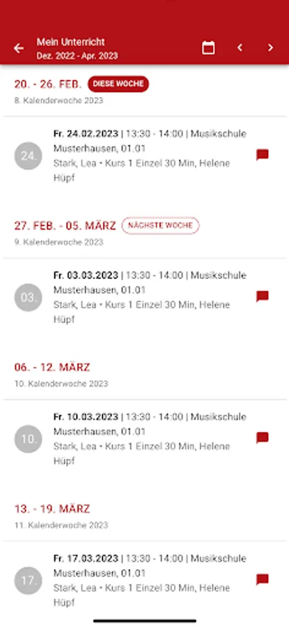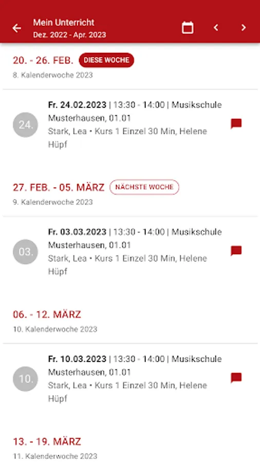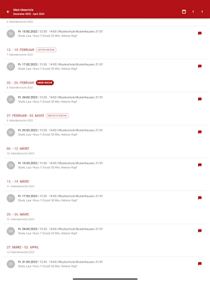 The transmission of messages between teachers, parents, students and the music school takes place via an app-internal ID and does not require any contact information. No e-mail addresses or mobile phone numbers are required for chatting and exchanging messages.