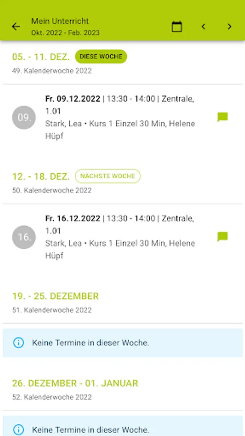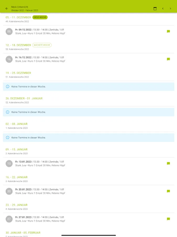 All functions for exchanging messages between teachers, parents, students and the music school do not require any contact information. Messages are transmitted via an app-internal ID. No email addresses or mobile phone numbers are required to chat and exchange messages!