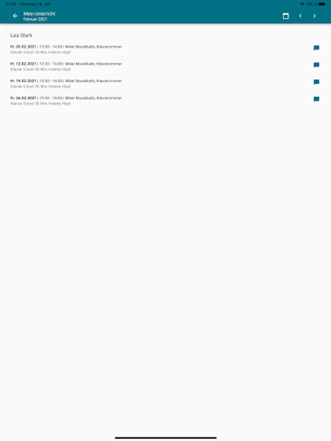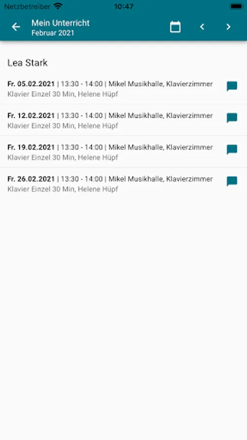 All functions for exchanging messages between teachers, parents, students and the music school do not require any contact information. Messages are transmitted via an ID that is internal to the app. No email addresses or mobile phone numbers are required for chat and message exchange!