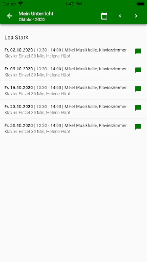 All functions for exchanging messages between teachers, parents, students and the music school do not require any contact information. Messages are transmitted via an ID internal to the app. No email addresses or cell phone numbers are required for chat and message exchange!