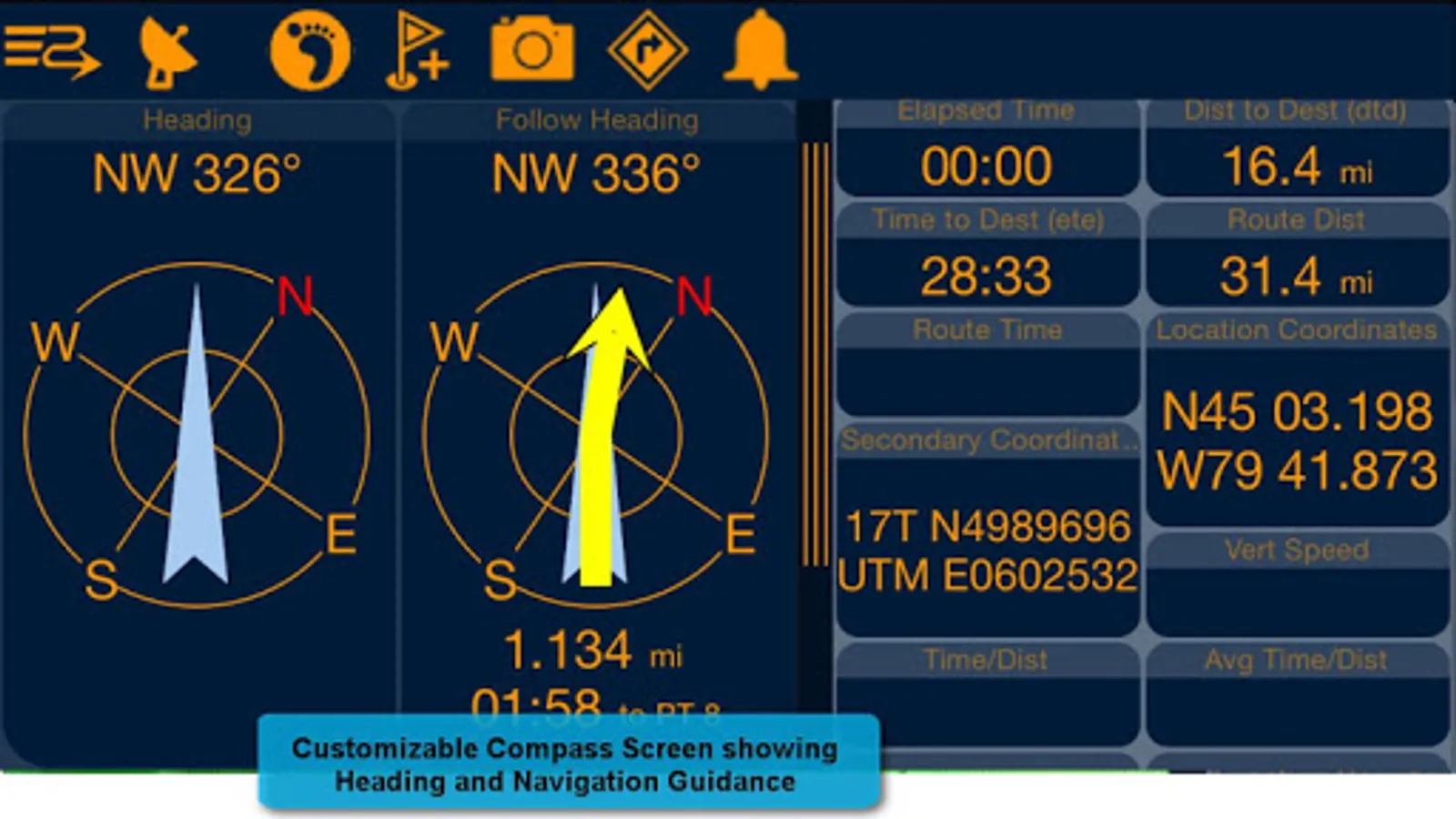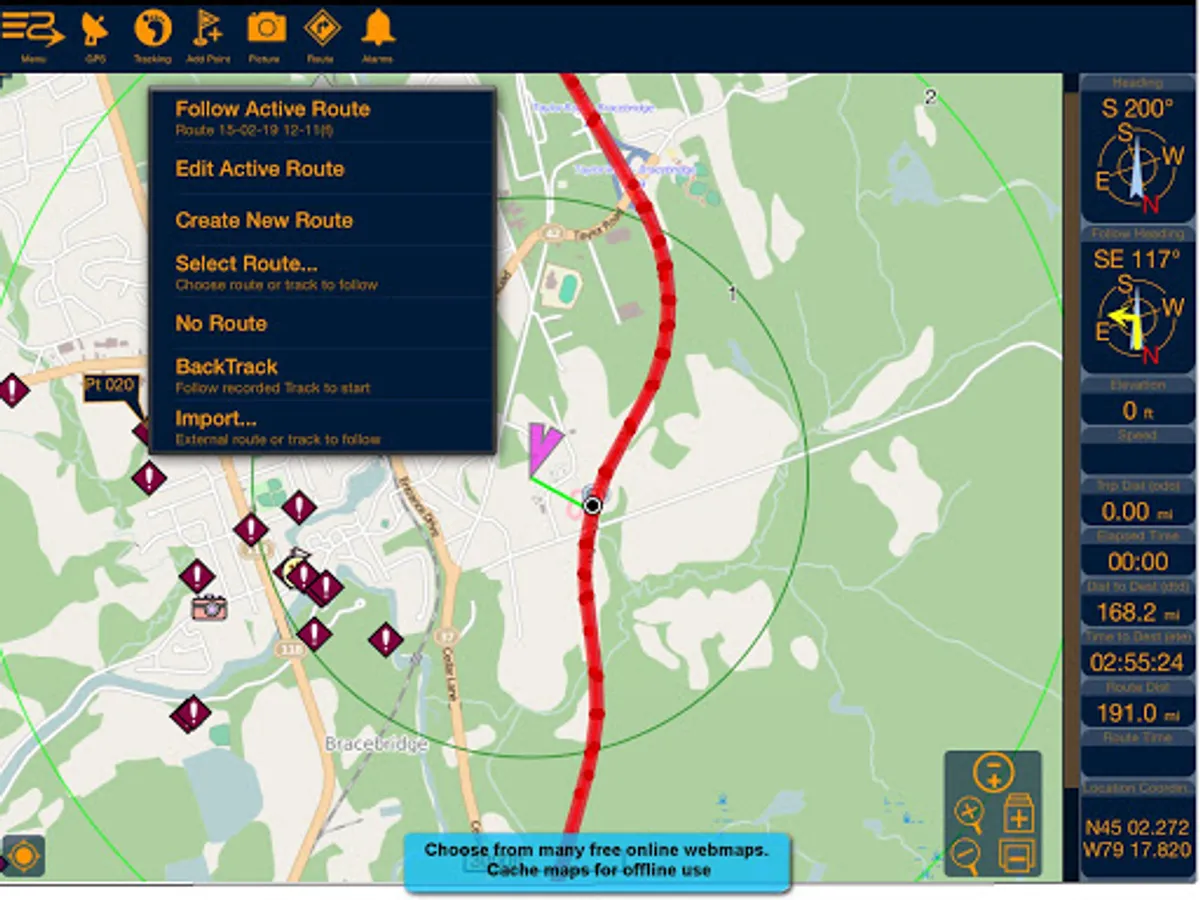 - Alarms to notify you when you've strayed off your route, or nearing a marked point;