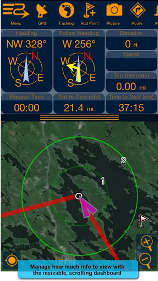 - Alarms to notify you when you've strayed off your route, or nearing a marked point;