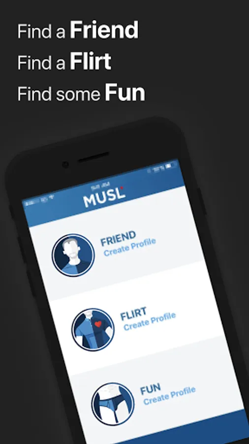 What kind of man are you looking for? MUSL is a new type of gay dating app which lets you easily meet with like-minded gay men who are looking for the same thing. MUSL gives you total control to express each and every part of you! Create three unique profiles: Friend, Flirt, and Fun to start meeting gay men in your local area! You can have just one profile or up to all three ;)