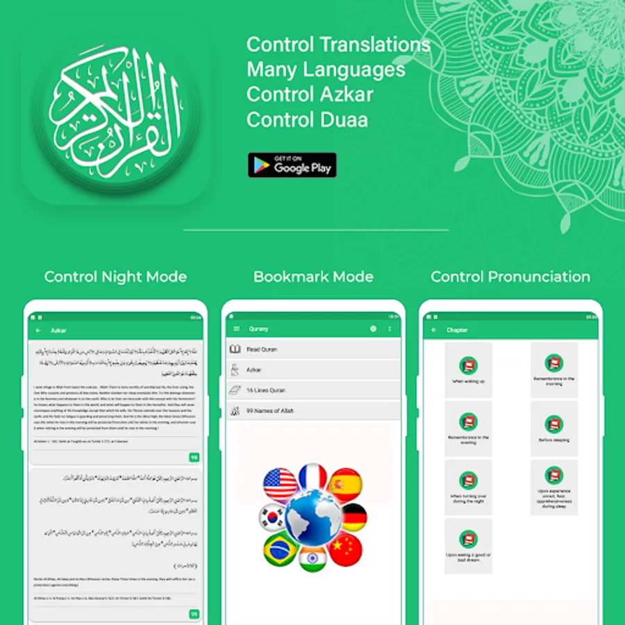 - translations (Quran Verses) / tafsir in over 6 different languages.
