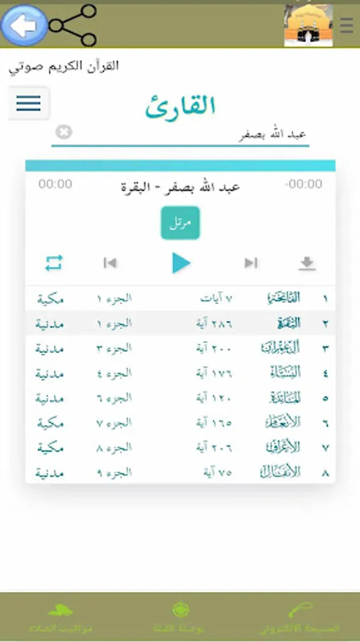 2. The Holy Quran with audio: It allows the user to listen to the recitation of the Holy Quran by the voices of famous reciters from different countries, to enhance the spiritual impact and communication with the dear book.