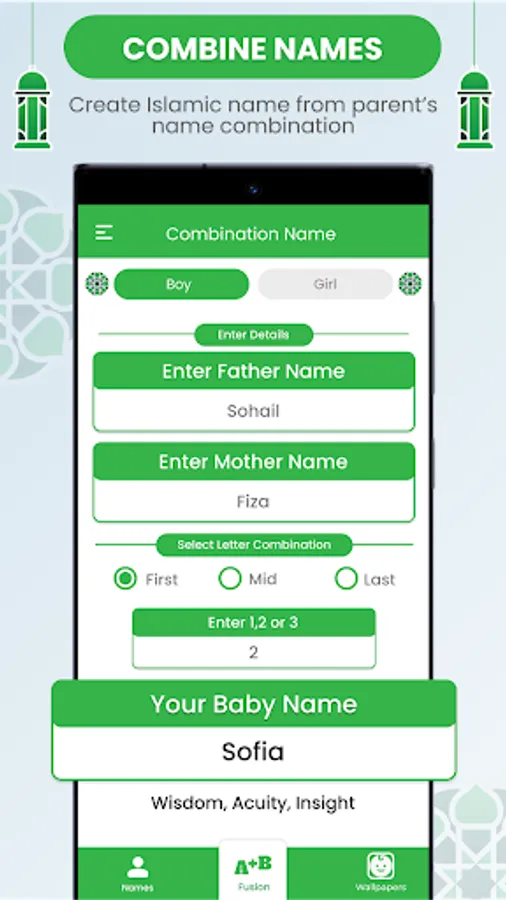We are introducing a unique feature in our app which is the parent's name combination (fusion). In which the father name and mother name mix together and create a unique and beautiful name for their baby.
