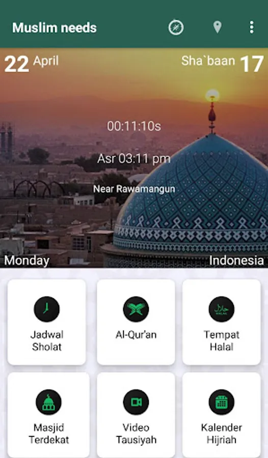Muslim needs is the application of prayer schedules, qibla direction, hijri calendar. The full list of Muslim needs features is as follows: