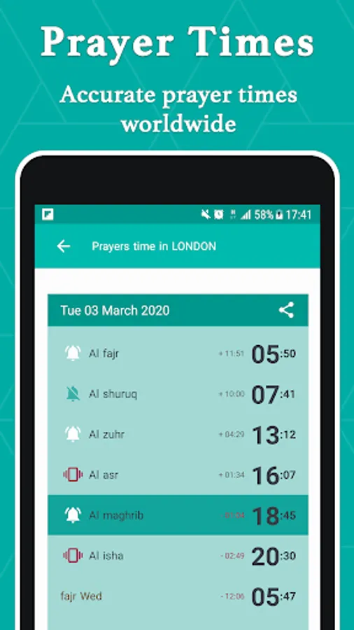 Muslim Prayer Times is the comprehensive Athan app that contains useful features such as Islamic Prayer Times (Fajr, Duhr, Asr, Maghrib, Isha), Qibla Finder, Islamic Calendar, Masjid Finder, Duas Kalima & Quran with translations. This app is also providing Ramadan 2020 timings, Monthly Prayer Timings and Nearby Mosques around your location.