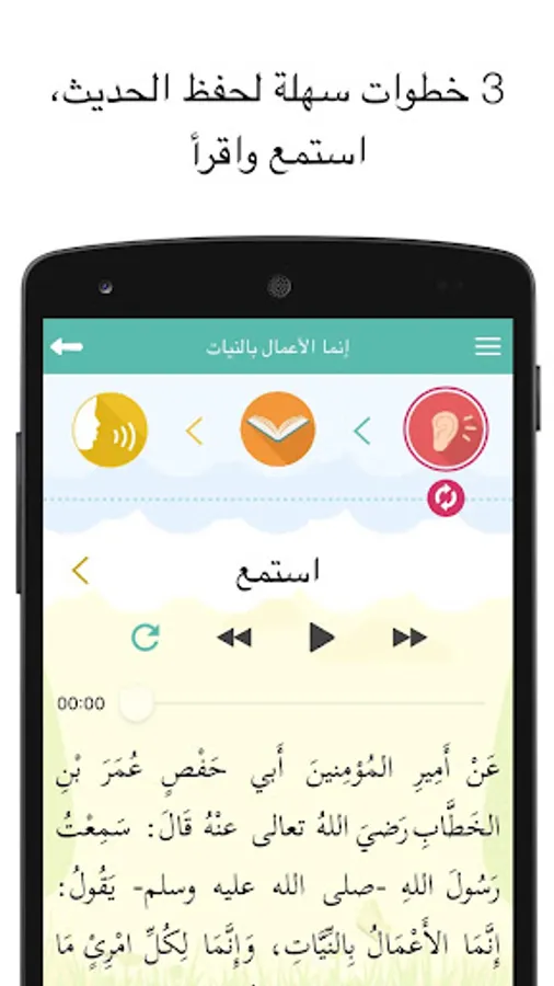 The application contains a text formed for hadiths and a wonderful vocal reading with a child's voice, mastered, divided into five ascending levels, including topics of belief and literature