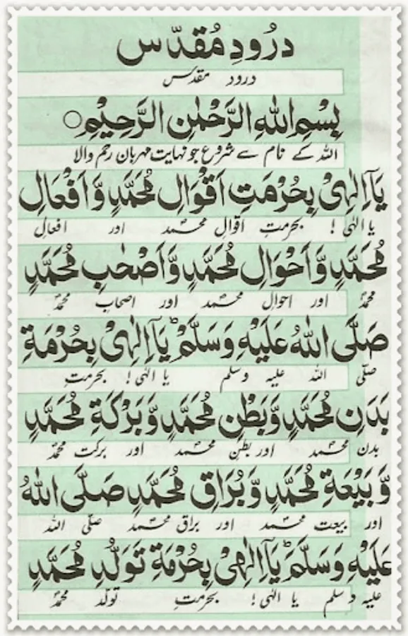 If one reads this Durood Shareef for 7 Thursdays at the time of Tahajjud 11 times then one will get Shifaa from all kinds of ailments/diseases and if one makes a taaweez of this Durood Shareef and puts it in his/her neck then one will become safe from all jinns and will also be safe from the shayaateen who create waswasaas (evil whispers) and irritations.