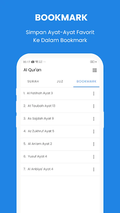 > Add and save reading or memorizing favorite verses or surahs into bookmarks.