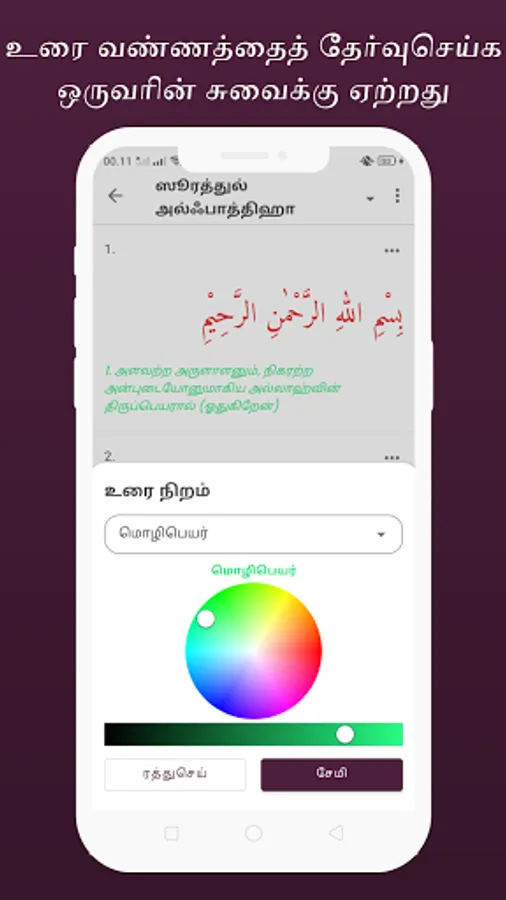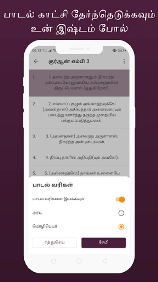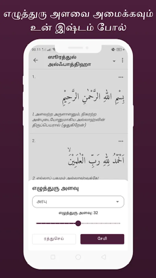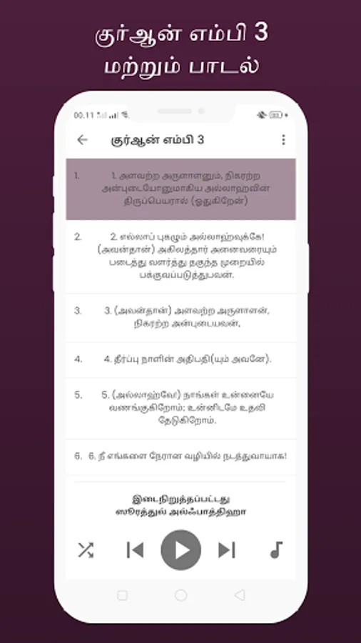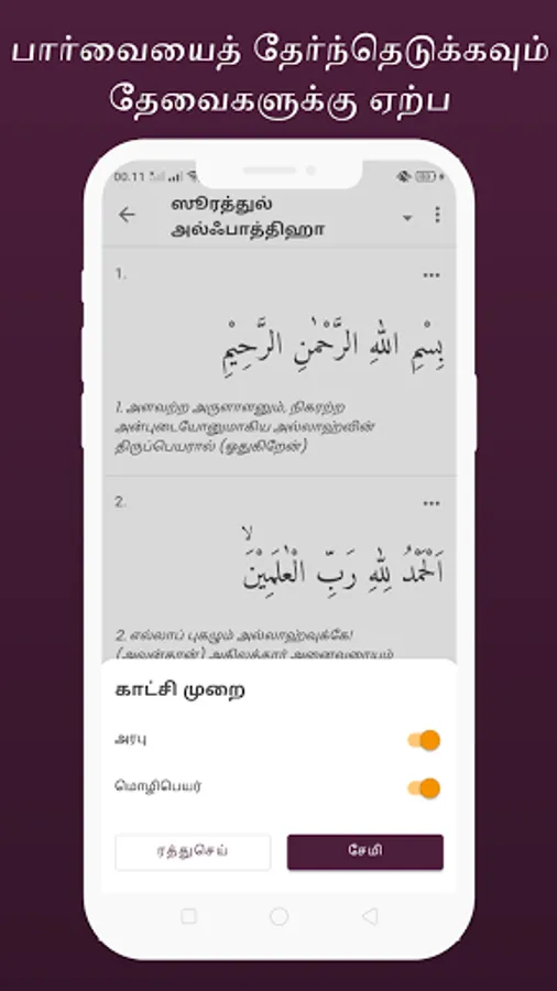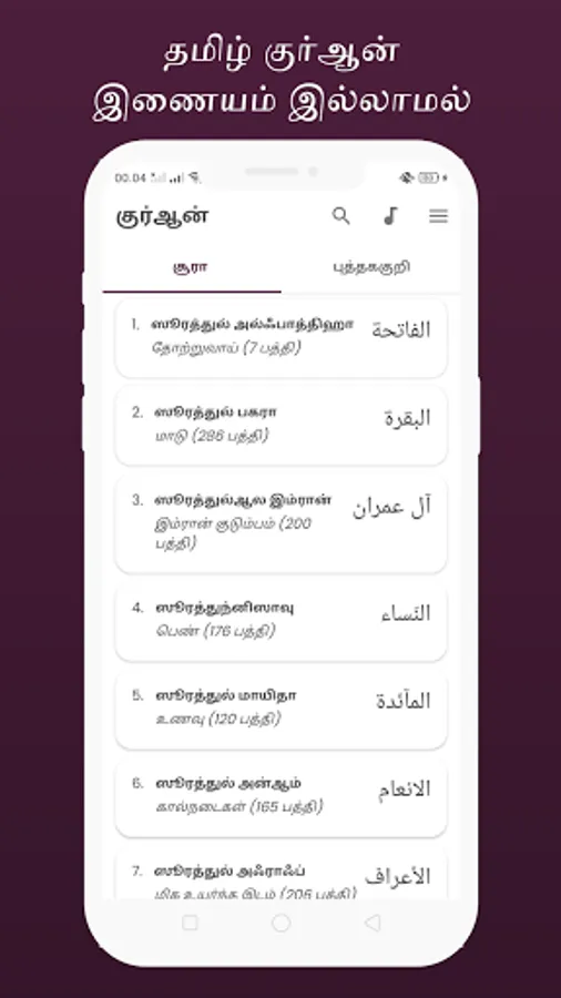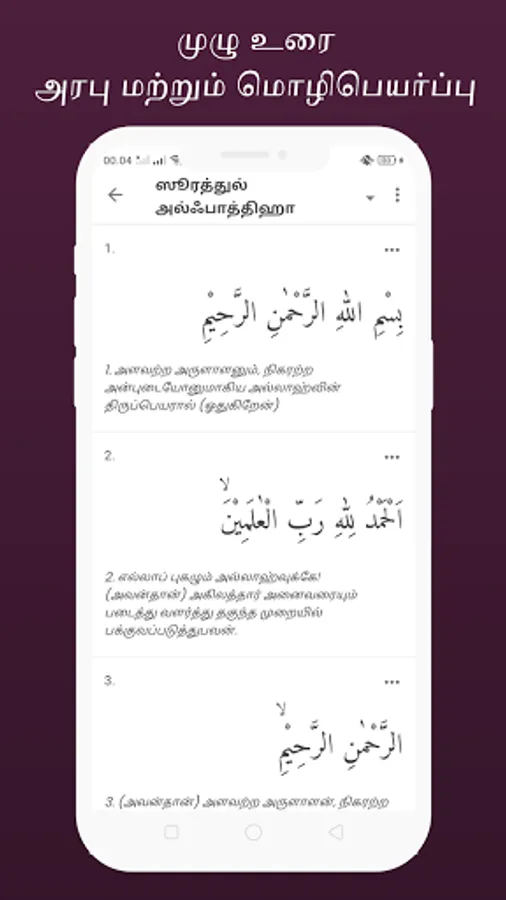 This Quran application contains Arabic text measurement, Tamil translation and audio.