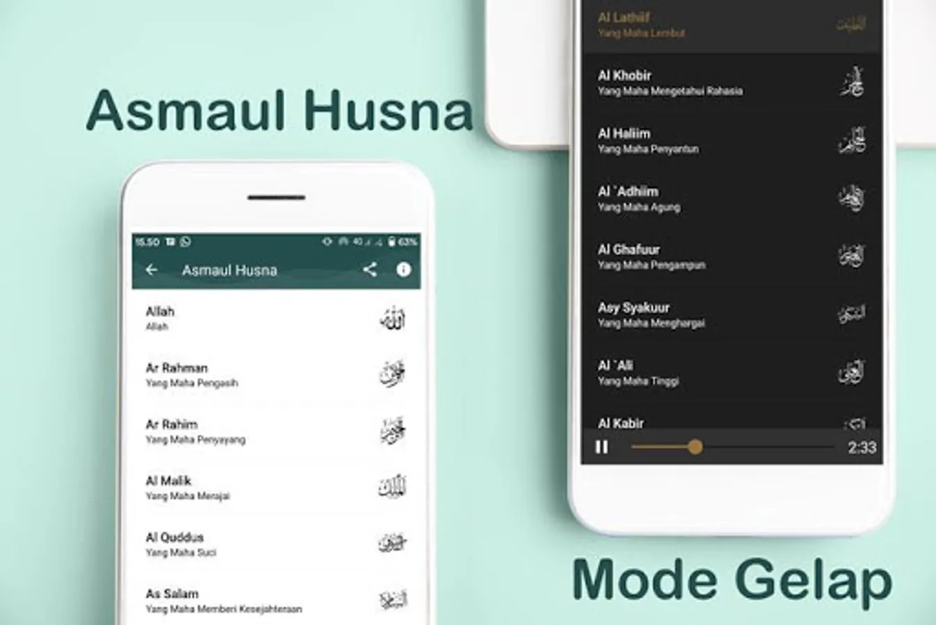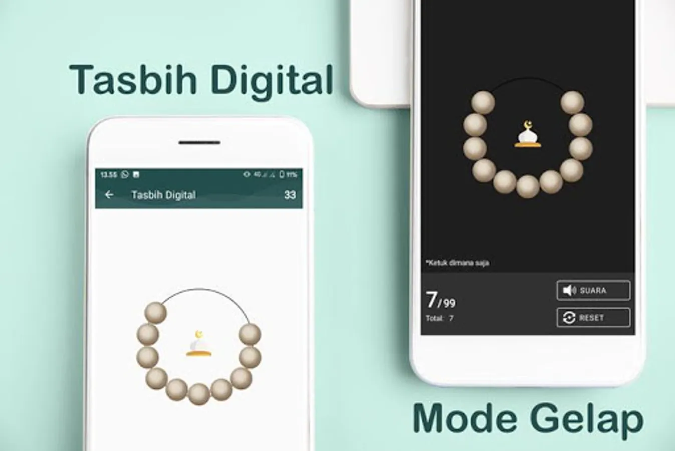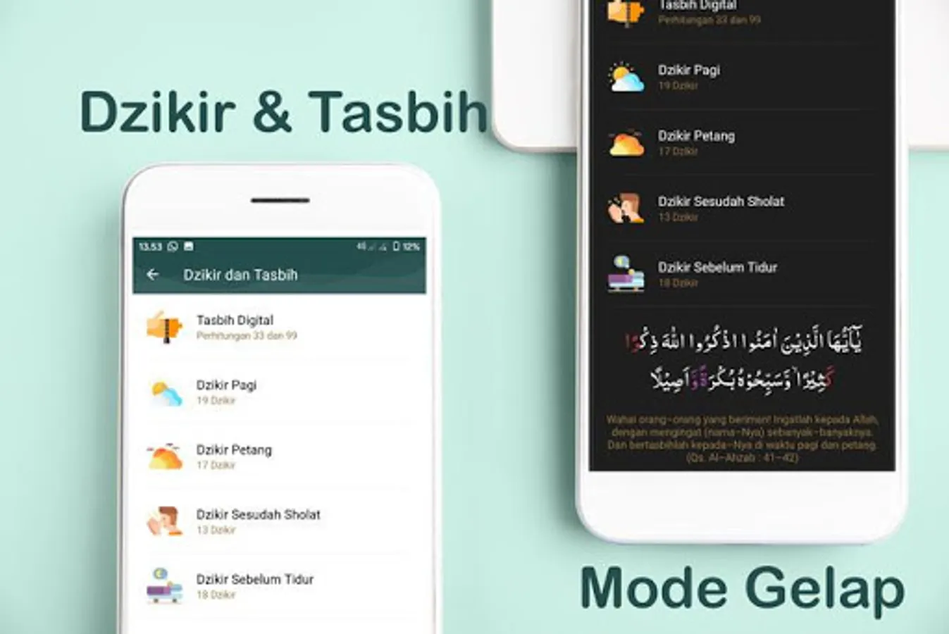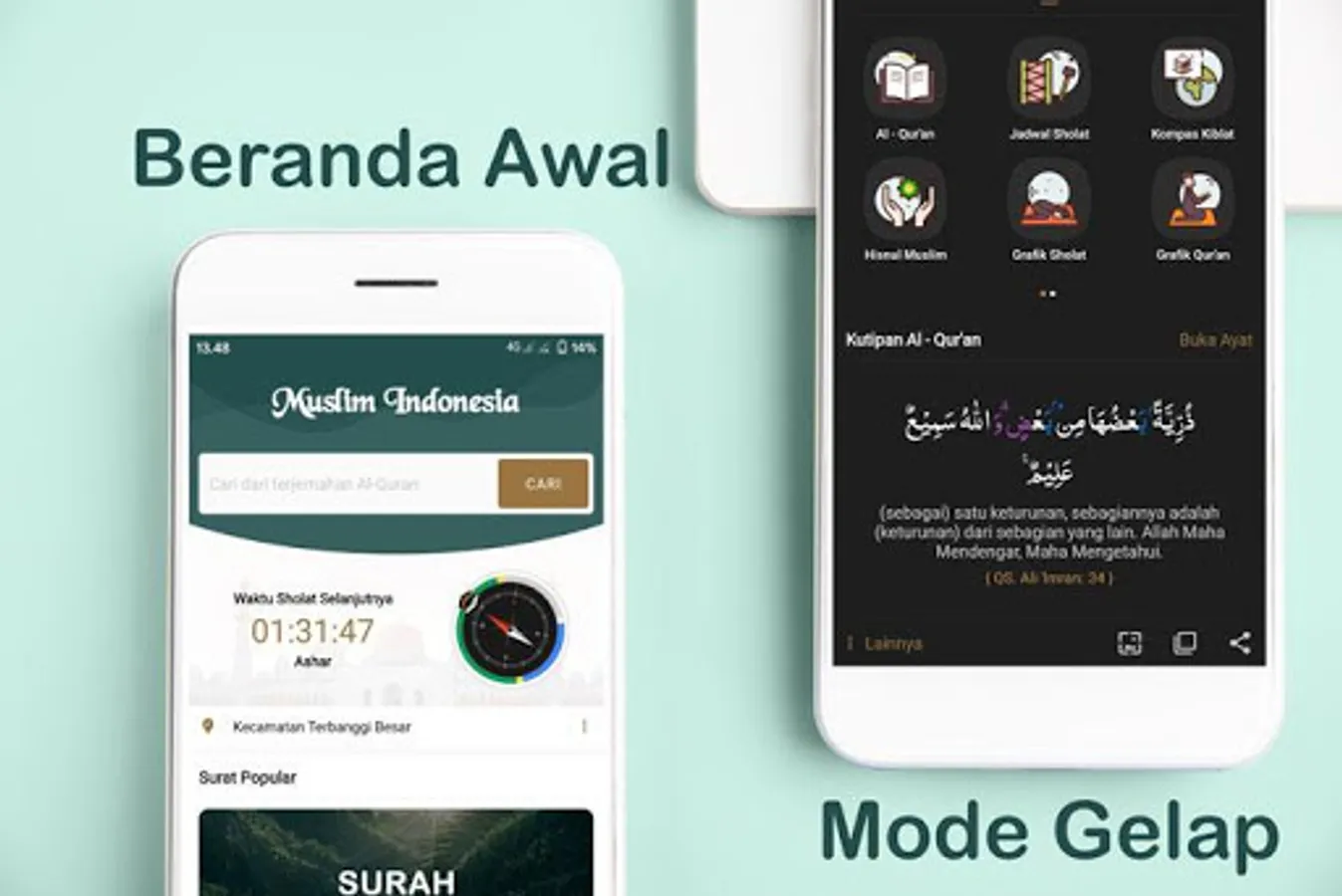 Features in the Indonesian Muslim application - Al-Qur'an, Prayer Schedules, Qibla, Asmaul Husna, Prayers, Dhikr & Digital Tasbih: