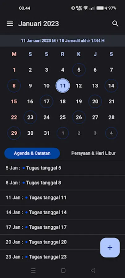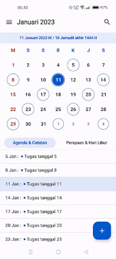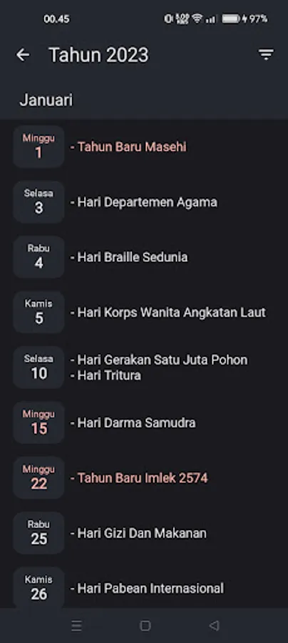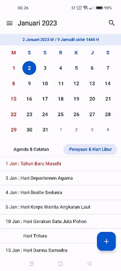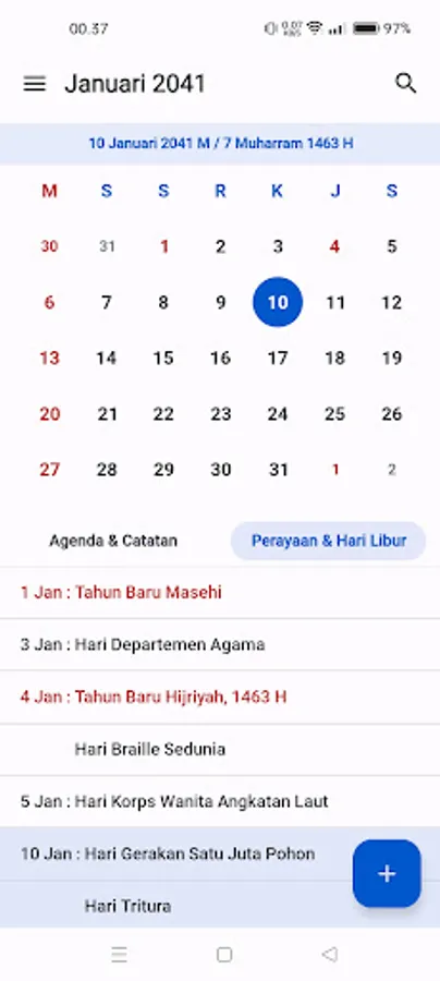 The My Calendar application is also equipped with holidays and national holidays from 1958 to 2050. Keep in mind that the calculation of the Hijri calendar from 2023 to 2050 in this application still uses the reckoning method. If in the future there are differences between the reckoning method and the rukyat method in determining Islamic holidays, then the calculation of the Hijri calendar in this application will be corrected through an update of this application in the Play Store.