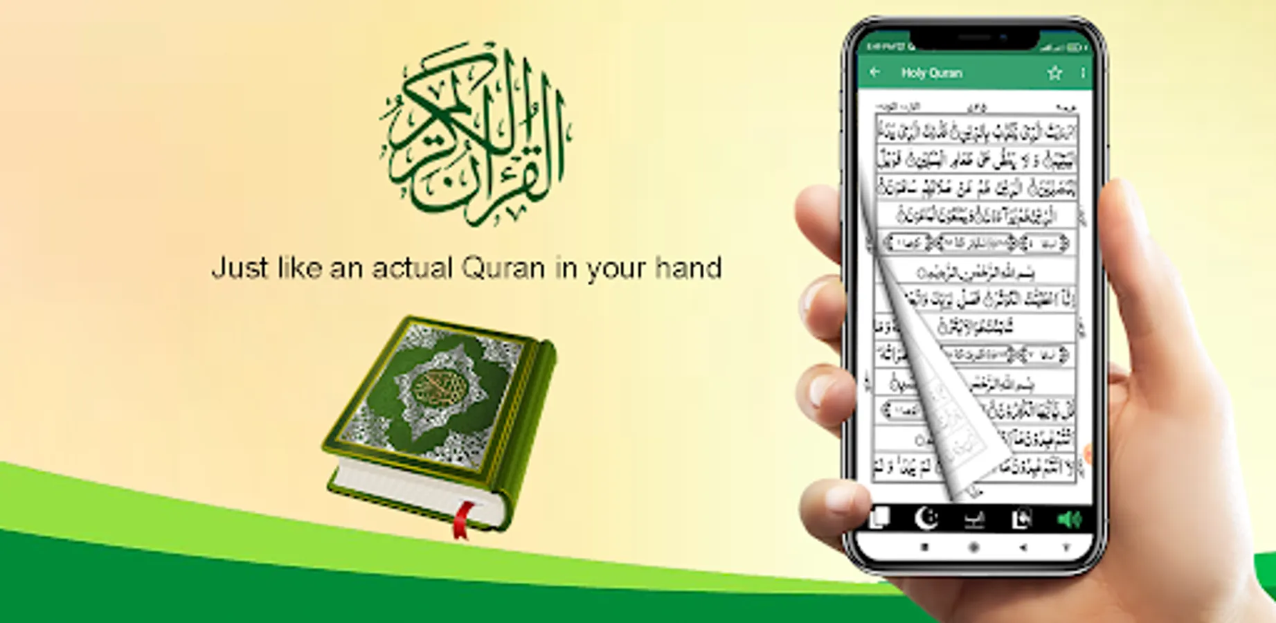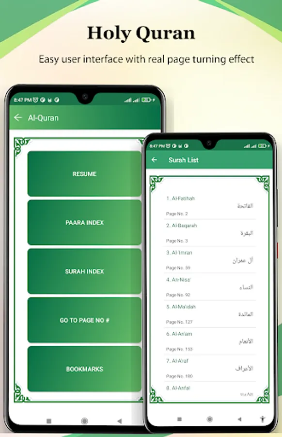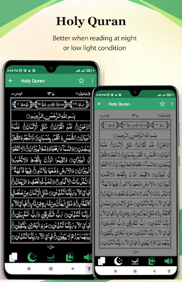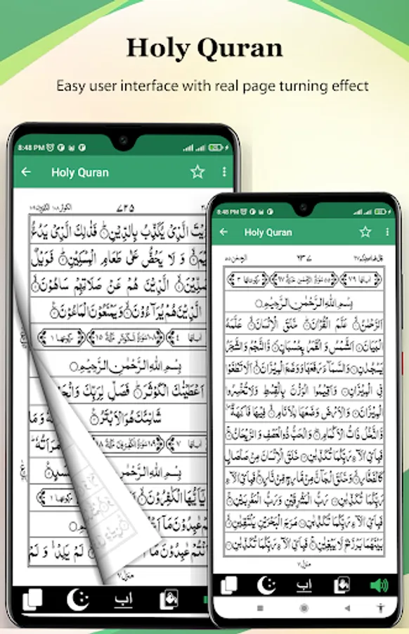 Holy Quran القرآن الكريم has an elegant style, Don't bother yourself by scrolling up and down; now easily recite as actual Color printed Quran page by page. Recite Holy Quran with actual experience, feels just like an actual Quran Book in your hand.